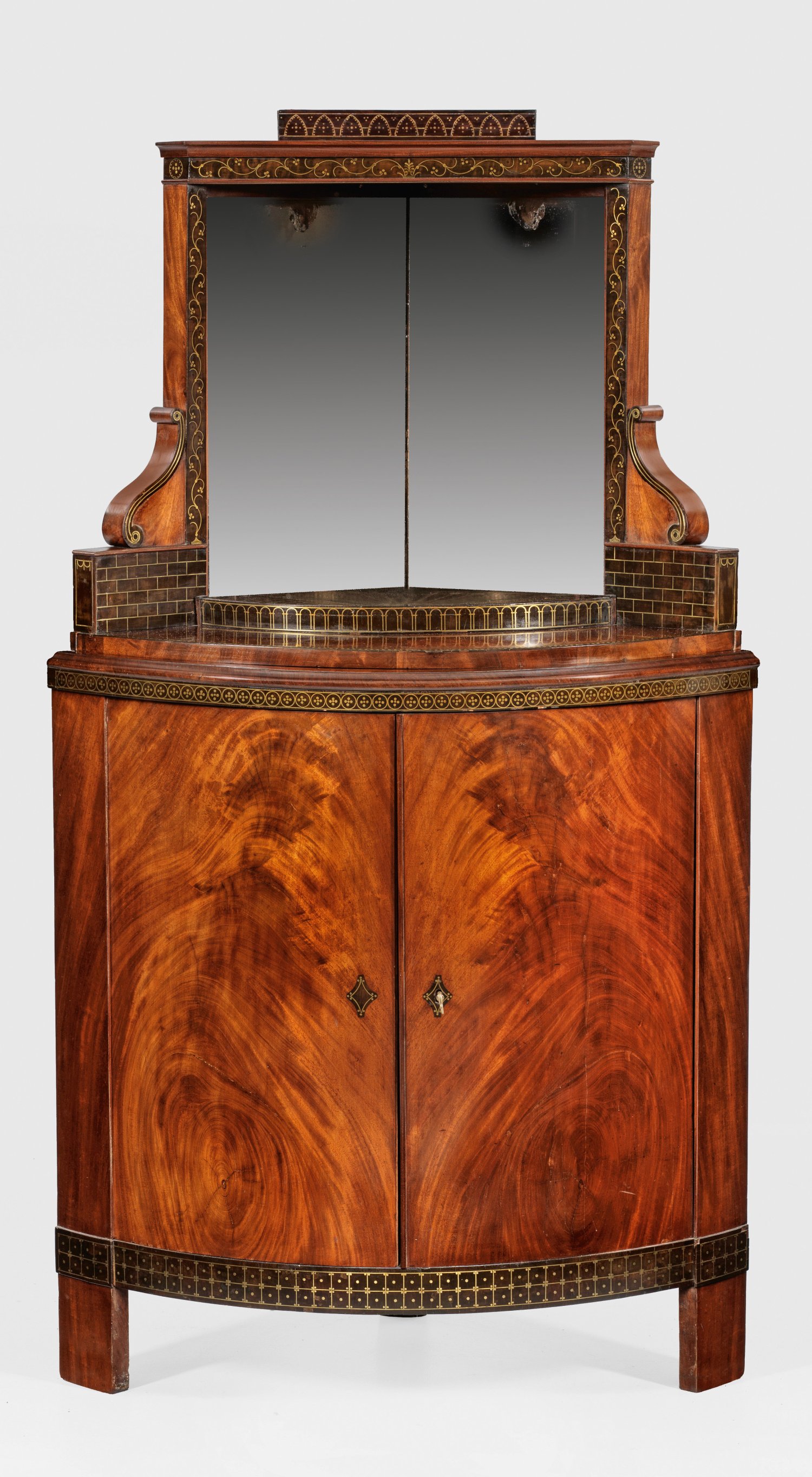 Mahagoni, auf Eichenholz, furniert und teilw. ebonisiert mit feinen Einlagen aus Messing. Bombierter, zweitüriger Korpus, flankiert von breiten Lisenen mit gekanteten Füßen. Zurückgesetzter, offengestalteter Aufsatz, flankiert von Volutenmotiven aus schmalen Sockeln. Mosaikartige galeriegerahmte Bodenfläche, sich durch verspiegelte Rückwand optisch zu einem Tondo ausweitend. Gestuft ansteigender oberer Abschluss mit schmalem Profil. Reicher Dekor aus unterschiedlichen Ornamentbändern und Gitterwerk. H. 164 cm. Schenkel-T 62 cm.