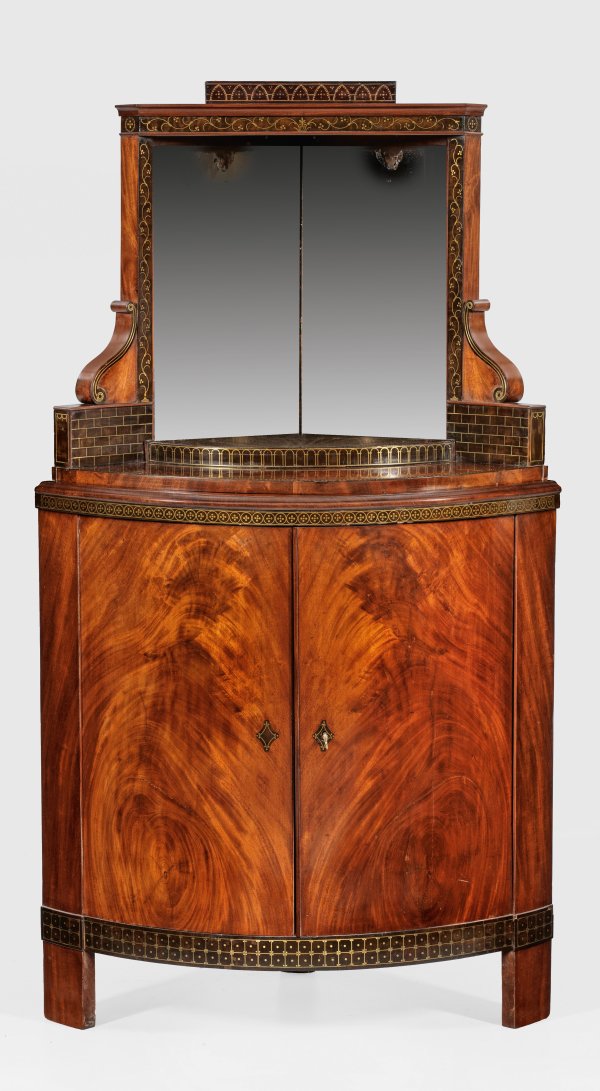 A Russian mahogany veneered Empire corner cabinet with inlays of brass. Circle of Heinrich Gambs.