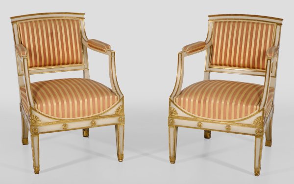 Buchenholz, teilw. geschnitzt, elfenbeinfarben gefasst und teilw. vergoldet. Trapezförmige, optisch ausgebogte Zarge mit erhaben reliefierten Rosettenmotiven auf konischen Vierkantbeinen. Geschweift ansteigende Stützen für schmale Armlehnen, in rechteckige Rückenlehnenrahmung mit leicht gewölbtem oberen Abschluss übergehend. Sitzfläche und Lehnen gepolstert und bezogen. H. 90 cm. 60 cm x 60 cm. Sitz-H. 44 cm.
