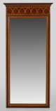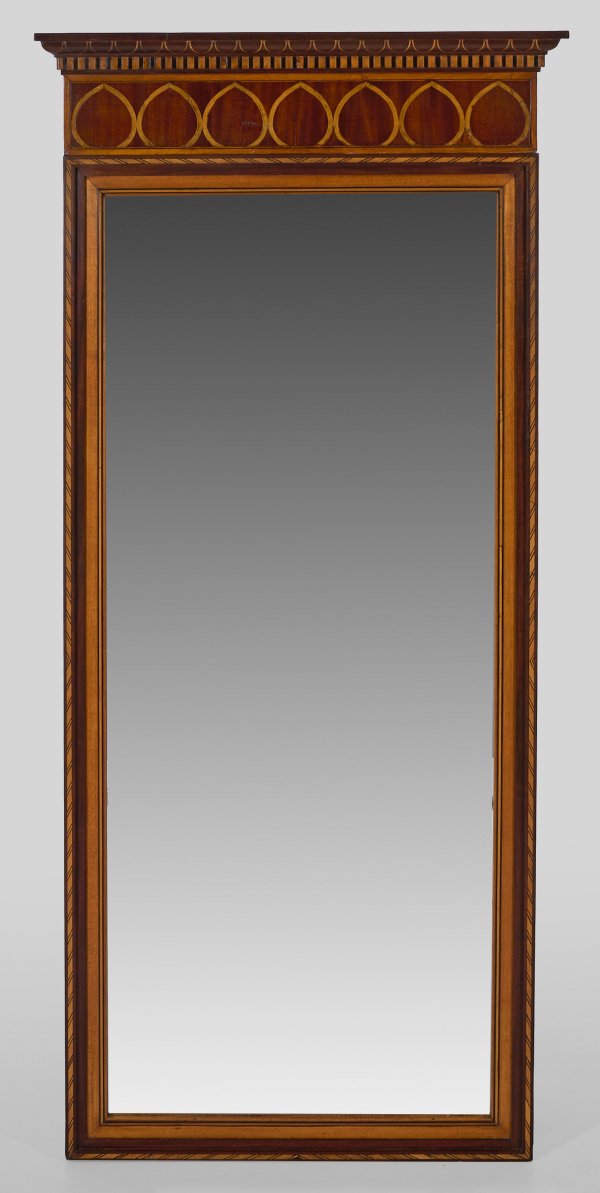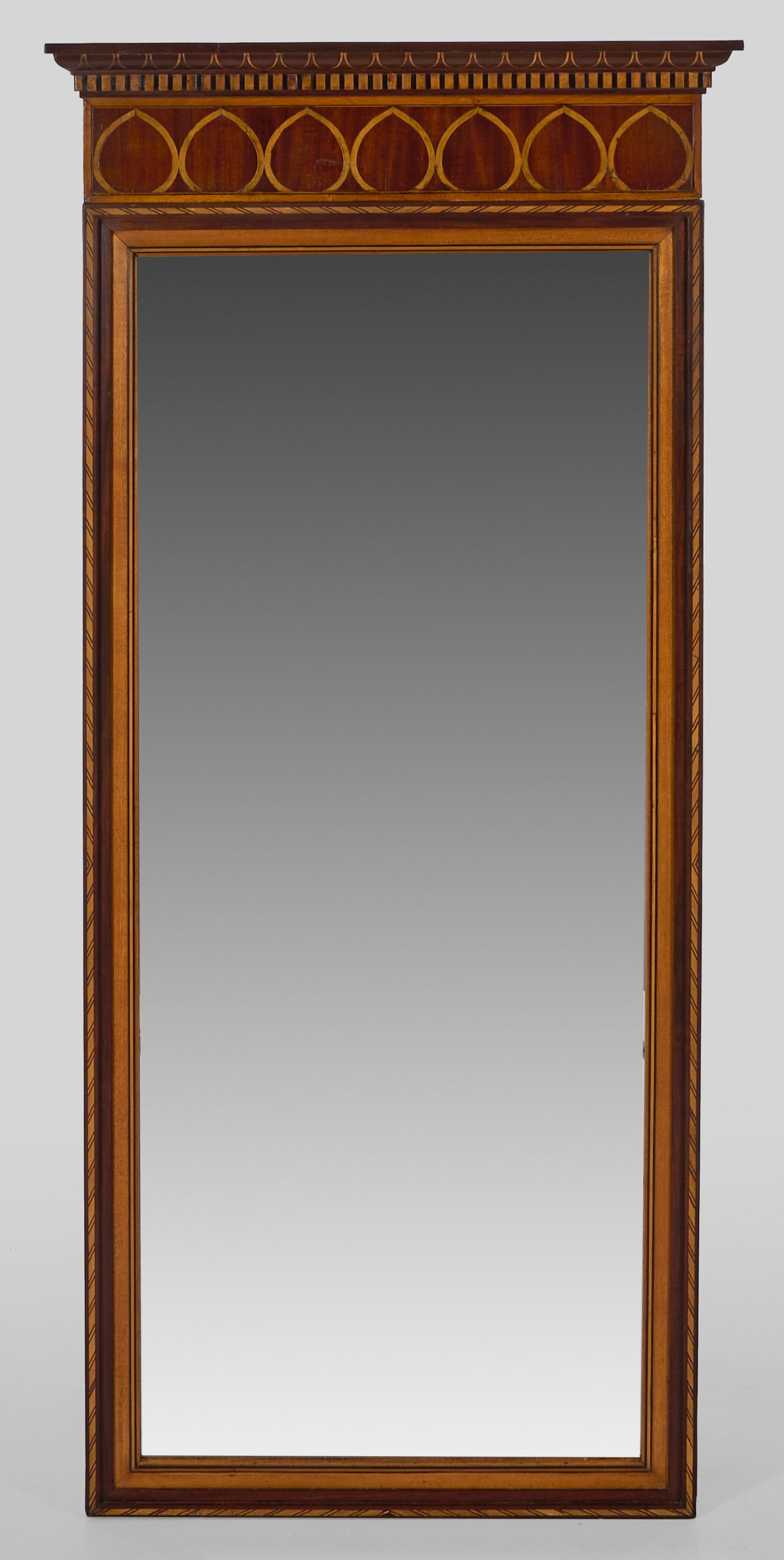 Mahagoni, furniert sowie Einlagen aus Ahorn. Gerade, hochrechteckige, umlaufend profilierte Spiegelrahmung aus unterschiedlichen Bändern. Oberhalb breiter Fries aus intarsiertem Eierstab sowie schmales, korrespondierendes Profilgesims. Erg. Spiegelglas. 184 cm x 83,5 cm.