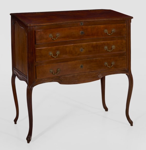 Nussbaum, massiv und furniert. Gerader, querrechteckig angelegter Korpus mit kassettierten Seiten, flankiert von gerundeten Ecklisenen, in hohe, geschwungene Beine übergehend. In der gegliederten Front drei breite, konkav eingezogene Schubladen. Oberhalb schräggestellte, aufklappbare Pultfläche. H. 127 cm. 126 cm x 58 cm.
