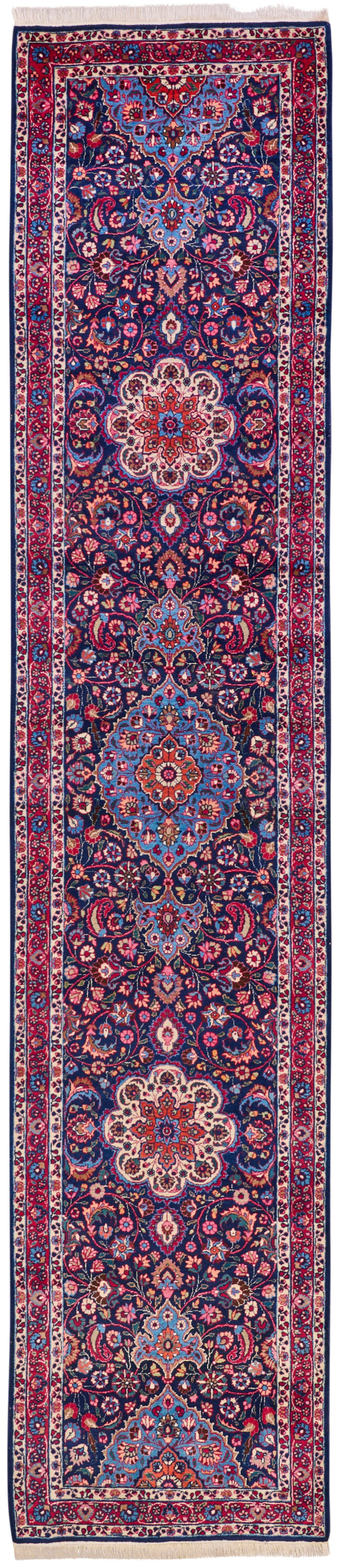 Persien. Mitte 20. Jh.; Wolle auf Baumwolle. Im blauen Innenfeld unterschiedliche Medaillons im Wechsel. Flächendeckend dichte Musterung aus Rankenwerk. Umlaufend breite, dreiteilige Bordüre mit korrespondierender Musterung. 512 cm x 105 cm.