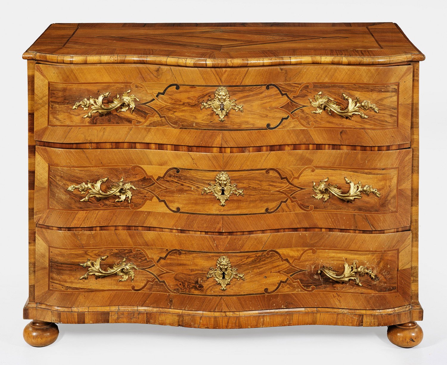 Nussbaum, furniert. Gerader, querrechteckig angelegter Korpus auf schmaler Zarge und gedrückten Kugelfüßen. In der gegliederten Front drei breite, mehrfach geschweifte Schubladen. Gering überstehende, profilierte Deckplatte. Flächendeckend breit gerahmte Furnierfelder, von schauseitig verschlungenen Bandeinlagen begrenzt. Altersspuren. H. 88,5 cm. 119 cm x 67,5 cm.