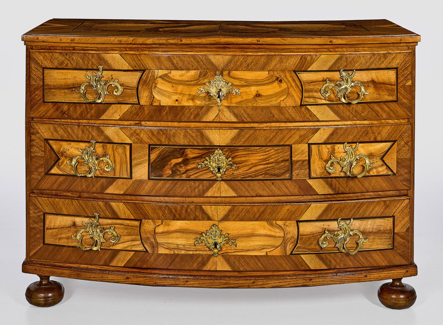 Nussbaum, furniert. Gerader, querrechteckig angelegter Korpus auf schmaler Profilzarge und leicht gedrückten Kugelfüßen. In der gegliederten Front drei breite, bombierte Schubladen. Gering überstehende, profilierte Deckplatte. Flächendeckend breit gerahmte Furnierfelder, von Band- und Fadeneinlagen begrenzt. H. 83 cm. 120 cm x 62,5 cm.