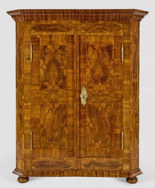 Nussbaum, furniert. Gerader, hochrechteckiger Korpus, flankiert von breiten, schräggestellten Ecklisenen auf schmaler Zarge und gedrückten Füßen. In der gegliederten Front zwei Türen. Leicht vorkragendes Kehlgesims als oberer Abschluss. Flächendeckend breit gerahmte Furnierfelder, von Bandeinlagen begrenzt sowie in der Front verschlungenes Bandelwerk. Erg.; H. 187,5 cm. 161 cm x 64 cm.