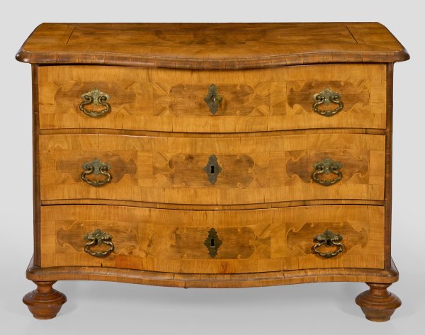 Nussbaum, furniert sowie Einlagen aus Eschenholz. Gerader, querrechteckig angelegter Korpus auf gewulsteter Zarge und gedrückten Balusterfüßen. In der gegliederten Front drei breite, geschweifte Schubladen. Gering überstehende Deckplatte. Flächendeckend breit gerahmte Furnierfelder, schauseitig mit Bandeinlagen. H. 78 cm. 110 cm x 60,5 cm.