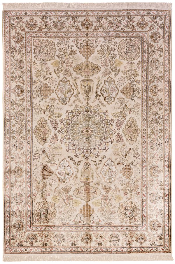 Türkei. Seide auf Seide. Im cremefarbenen Innenfeld beige-braunes Zentralmedaillon sowie flächendeckende Musterung aus Kartuschenmotiven, Palmetten und Blütenrispen. Umlaufend breite, korrespondierende Bordüre mit Vasenmotiven, begrenzt von schmalen Bändern. 266 cm x 182 cm.