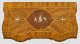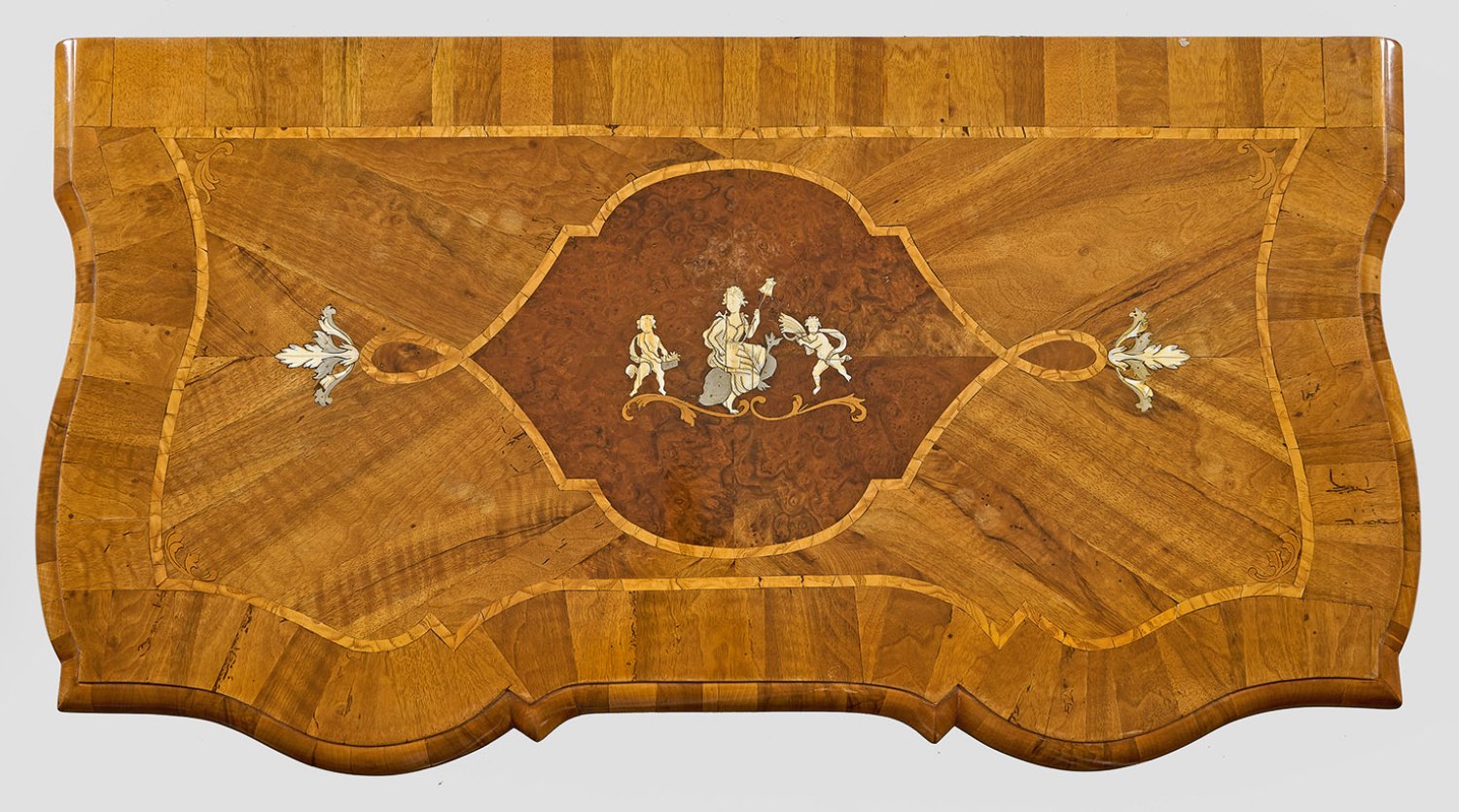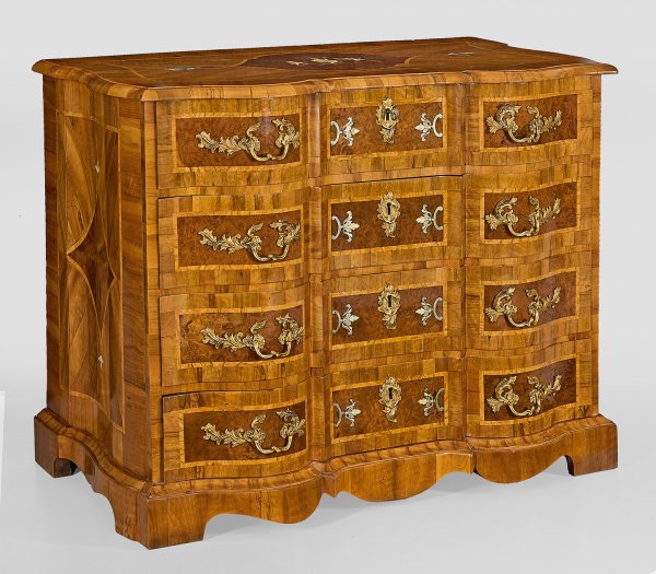 Nussbaum und Nussbaummaser, furniert sowie Einlagen aus Eschenholz, graviertem Zinn und Elfenbein. An den Seiten geschweifter Korpus auf gekehlter Zarge und gesägten Füßen. In der gegliederten Front vier breite, gegenläufig geschweifte Schubladen. Gering überstehende, korrespondierende Deckplatte mit figürlicher Einlage. Flächendeckend breit gerahmte, Furnierfelder, von Bandeinlagen begrenzt. Üppige, blattreliefierte Bronzebeschläge. H. 94 cm. 120 cm x 64,5 cm. CITES-Bescheinigung liegt vor.