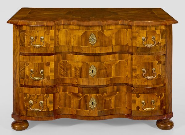Nussbaum, furniert sowie Einlagen aus Eschenholz. Gerader, querrechteckig angelegter Korpus auf schmaler Zarge und gedrückten Füßen. In der gegliederten Front drei breite, gegenläufig geschweifte Schubladen. Korrespondierende Deckplatte. Flächendeckend breit gerahmte Furnierfelder, schauseitig von Bandeinlagen begrenzt. H. 73 cm. 114 cm x 56 cm.