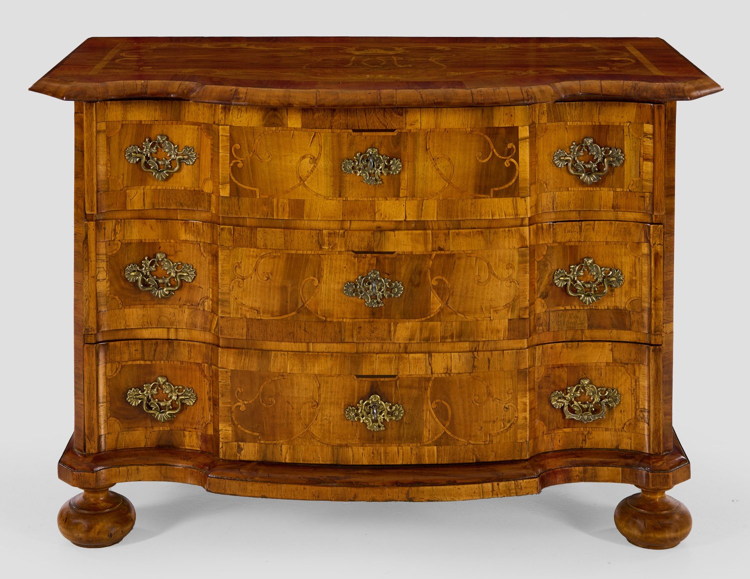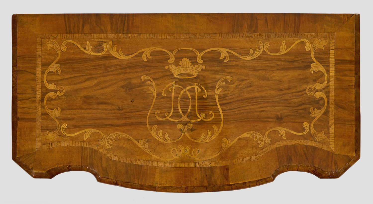 Nussbaum, furniert sowie Einlagen aus Eschenholz. Gerader, querrechteckig angelegter Korpus, flankiert von schmalen Ecklisenen, auf gewulsteter Zarge und gedrückten Füßen. In der gegliederten Front drei breite, gegenläufig geschweifte Schubladen. Flächendeckend breit gerahmte Furnierfelder. Weit überstehende Deckplatte mit zentralem, bekröntem Monogramm, umgeben von Blattwerk. H. 78 cm. 114 cm x 59,5 cm.