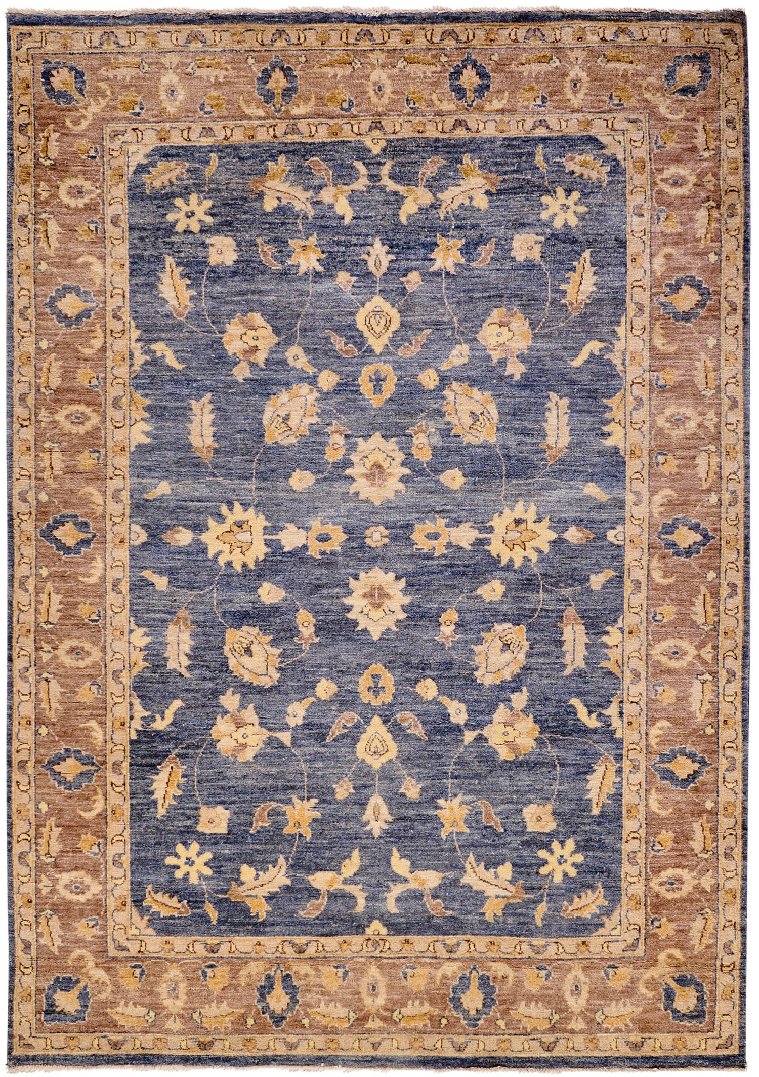 Pakistan. Wolle auf Baumwolle. Im hellblauen, abraschierten Innenfeld flächendeckende Musterung aus Palmettenranken. Umlaufend breite, hellbraune Bordüre. 246 cm x 168 cm.