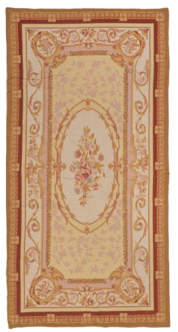 Wolle in sog. Gobelin-Stickerei. Auf hellgelbem Fond großes Ovalmedaillon mit Blütendekor sowie flächendeckende Musterung aus Blattwerk. Umlaufend breite Bordüre aus Medaillons und Blattvoluten. 254 cm x 130 cm.