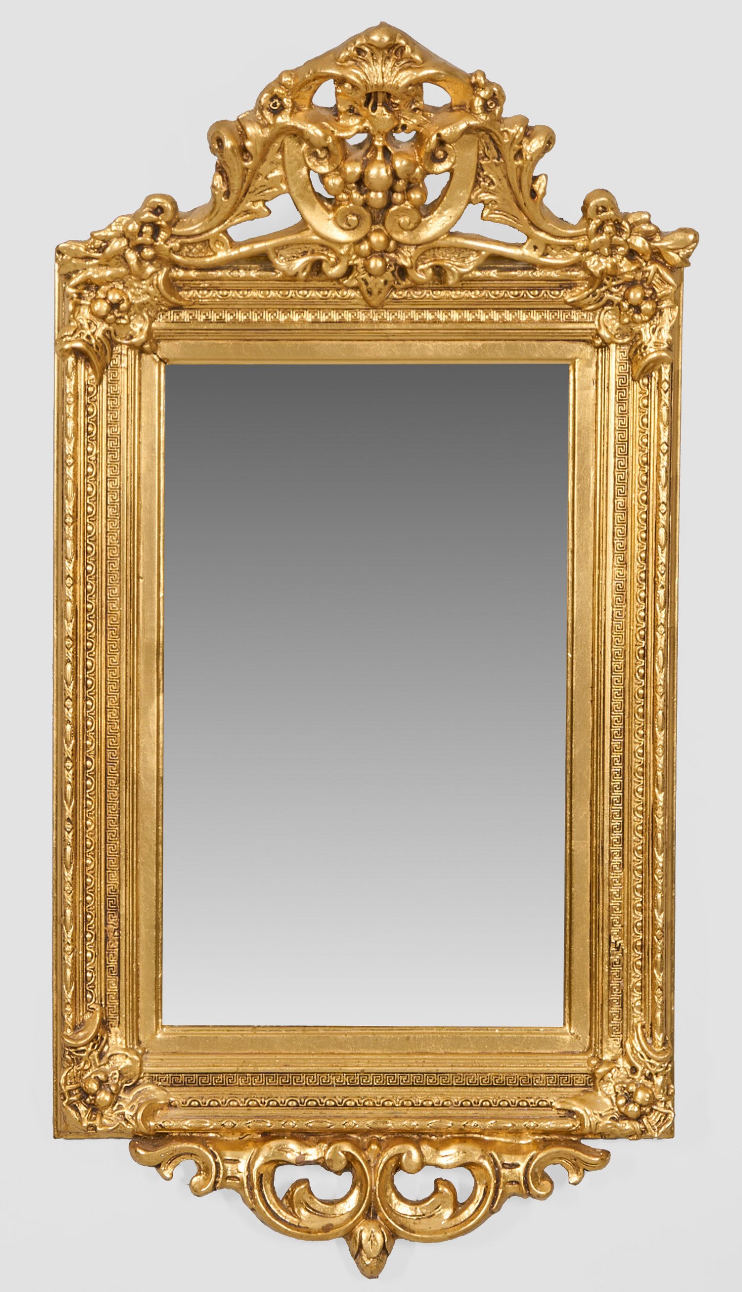 Holz, stuckiert, gefasst und neu vergoldet. Hochrechteckige profilierte Spiegelrahmung. Vorkragende, durchbrochen gearbeitete Bekrönung aus gegeneinadergestellten Voluten und Blattwerk sowie korrespondierender unterer Abschluss. 80 cm x 41 cm.