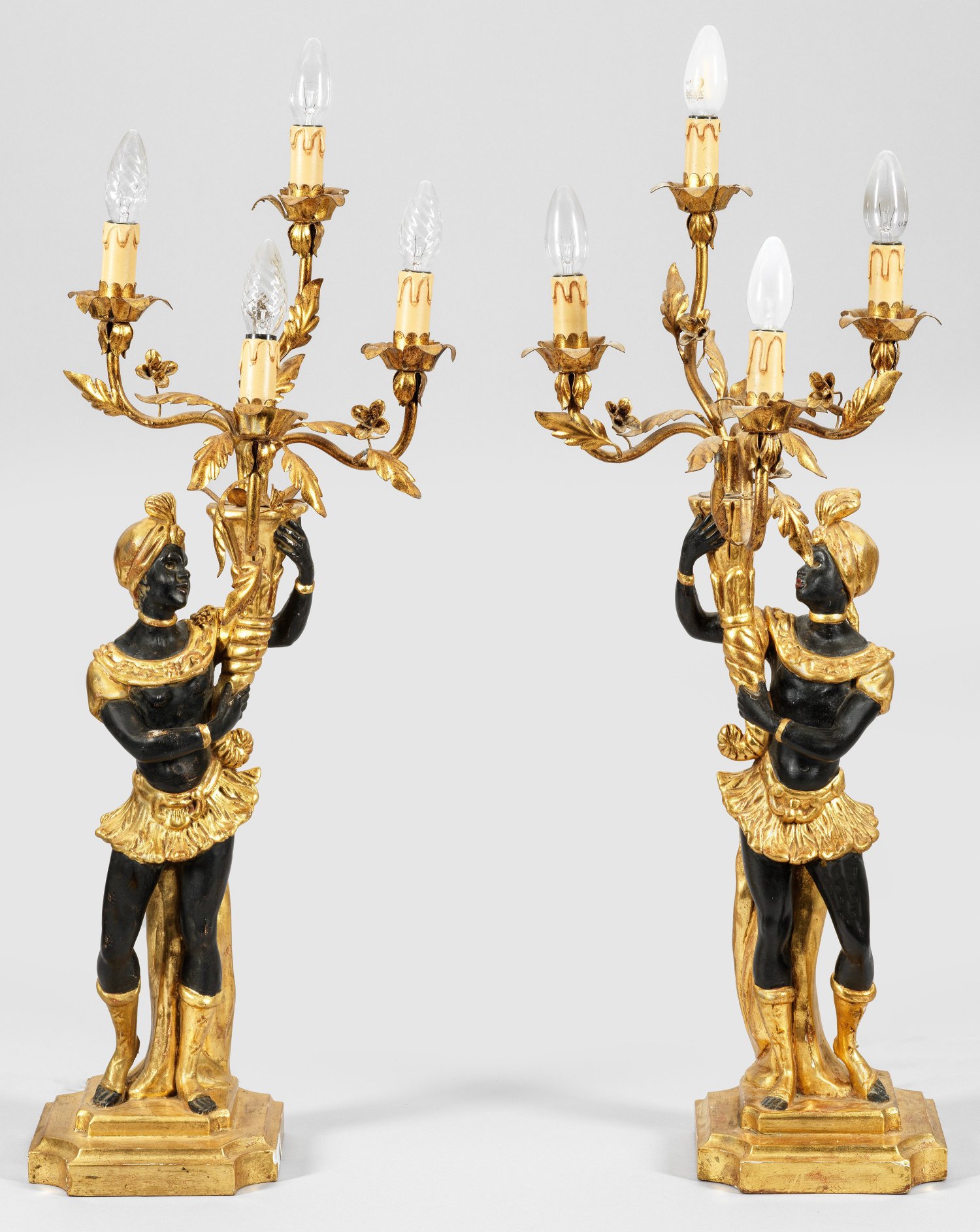 Gegenstücke. Metall und Holz, geschnitzt, teilw. gefasst und vergoldet. Über flachem Profilsockel mit konkav eingezogenen Ecken vollplastische Darstellung von venezianischen Mohren mit Füllhörnern. Oberhalb davon ausgehend stark geschwungene Leuchterarme als Träger für Leuchtmittel. Unw. besch.; Ges.-H. 90 cm.