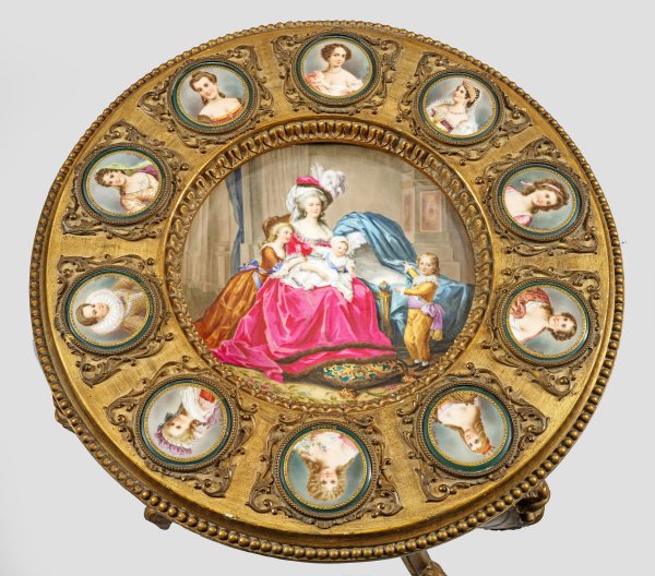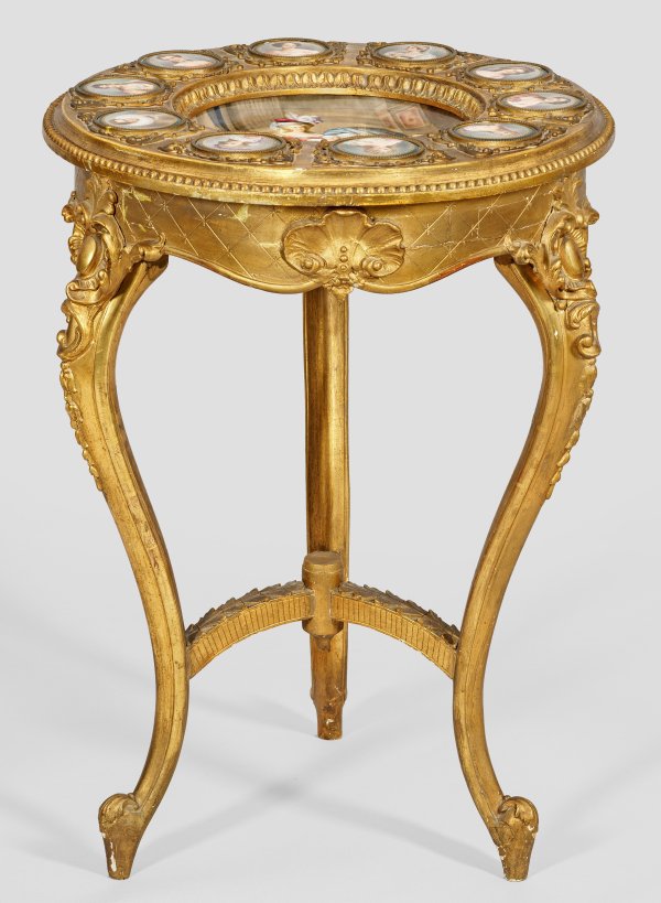 Holz, stuckiert und goldfarben gefasst sowie Porzellan, polychrom bemalt. Passig geschweifte Zarge mit applizierten Rocaillen auf stark geschwungenen Volutenbeinen. Gering überstehende Deckplatte mit umlaufendem Fries aus Perlstab. In der Mitte tief eingelassenes Porzellanbecken mit der Darstellung Marie Antoinettes mit ihren Kindern nach Elisabeth Vigée-Lebrun, sign., W. Schidler. Umlaufend korrespondierende von Volutenspangen begrenzte Porträtmedaillons u.a. mit Darstellungen von Margarethe von Dänemark, Königin Luise, Sophie Potocka und Gabrielle d'Estrées. H. 74 cm. D. 52 cm.