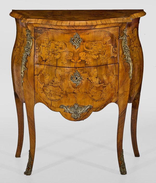 Nussbaum, furniert sowie Einlagen aus Ahorn. Dreiseitig bombierter Korpus, flankiert von schmalen, weit ausgezogenen Ecklisenen, in ausgestellte Beine übergehend. In der gegliederten Front zwei Schubladen sans traverse. Gering überstehende, profilierte Deckplatte. Flächendeckende Furnierfelder sowie üppige eingelegte Volutenmotive, Blüten und Hermen. H. 85,5 cm. 74 cm x 36 cm.