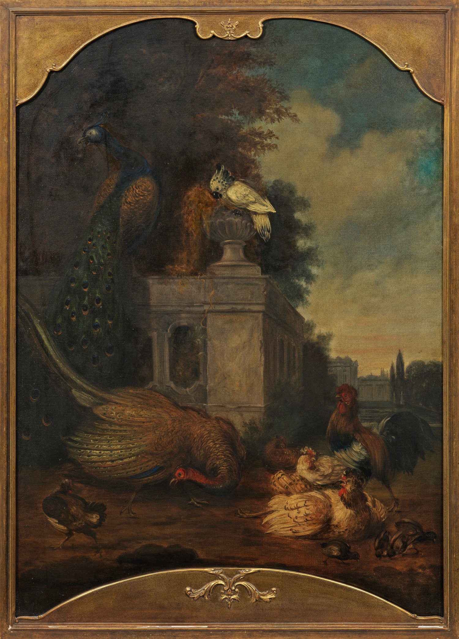 Großformatiges, dekoratives, ober- und unterhalb geschweiftes Tierbild mit der Darstellung von zwei Pfauen, einem Kakadu und einer Hühnerfamilie im Vordergrund, in der südlichen Parklandschaft eine repräsentative Barock-Architektur aus einer Balustrade mit Steinvase, im Hintergrund ein Schloss. Der auf Vogeldarstellungen spezialisierte holländische Maler beeinflusste, wie es auch in diesem Tierstück augenfällig ist, wesentlich die Malerei des Barock und nachfolgender Generationen mit diesem Themenkreis. Ein Hauptmotiv im Oeuvre Hondecoeters bildeten Pfauen, die auch auf diesem Gemälde wiederkehren. Öl/Lwd.; 132 cm x 96 cm. Rahmen.