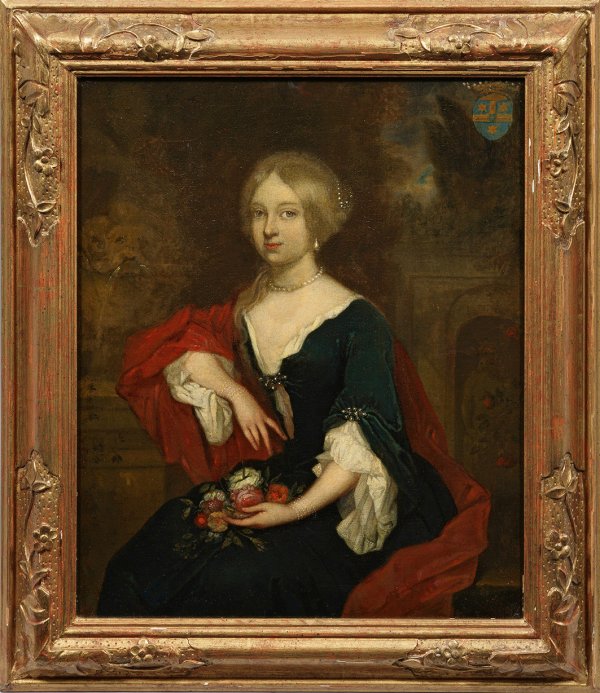 In fein lasierender Malweise ausgeführtes, meisterhaftes, höfisches Bildnis des bedeutenden holländischen Porträtisten. Die jugendlich schöne, elegante, blonde Adelige wird sitzend als Dreiviertelfigur vor einer illusionistischen Parklandschaft geschildert. Den Körper leicht diagonal im Raum komponiert, schaut die Dame den Betrachter mit leichtem, sanftem Lächeln schier en face an; während sie in ihrer linken Hand im Schoß verschiedene Blüten hält, stützt sie ihren rechten Arm auf, um die Finger der Hand in graziöser Geste spreizen zu können. Gewandet in ein dunkelblaues Samtkleid mit weißem Unterkleid und einem leuchtend roten Umhang zeigt sie ihren Stand durch reichen Perlen- und Edelsteinschmuck. Dass die Dargestellte eine Adelige ist, wird durch das sichtbar platzierte Grafenwappen in der rechten oberen Ecke verdeutlicht. Mijtens wurde 1642 Meister der Lukas-Gilde und war zeitlebens ein gefragter Bildnismaler des Adels sowie der rangvollen und vermögenden Gesellschaft. Hierbei porträtierte er auch eine Reihe von Mitgliedern des weitverzweigten und in den Niederlanden regierenden Hauses Nassau. Öl/Lwd., doubl.; L. u. sign. u. undeutl. dat.; 48,5 cm x 41 cm. Rahmen.