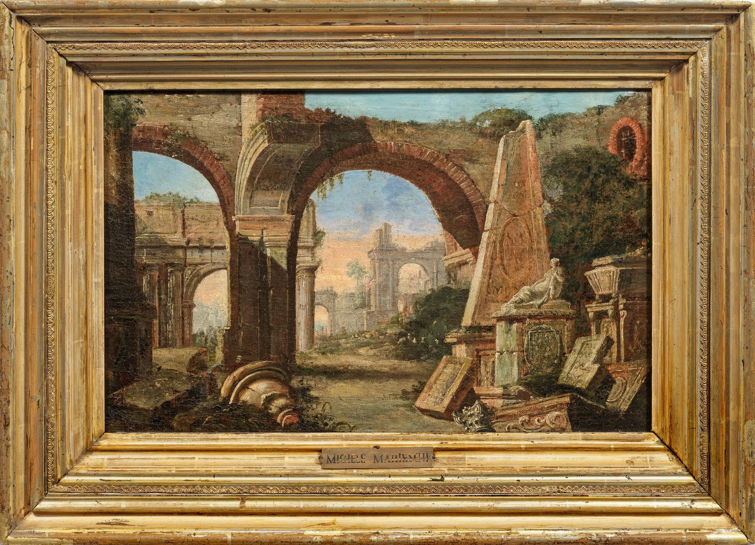 In der Capriccio verbindet der Maler unterschiedlichste Architekturelemente der römischen Antike, wobei die Bögen der Ruinen kompositionell auch dazu dienen, die Licht- und Farbeffekte einer Morgen- oder Abendstimmung zu verstärken und in ihrer Staffelung räumliche Tiefe zu evozieren. Währenddessen bildet rechts im Vordergrund ein stilllebenartiges, dichtes Ensemble aus einem Obelisken, Grabmälern und Architekturfragmenten einen Ruhepol. Marieschi war einer der bedeutendsten Maler venezianischer Veduten und Capricci seiner Zeit. Um 1735 kehrte er aus Deutschland nach Venedig zurück, wo er 1736 Mitglied der Malergilde wurde. Mit solchen Ruinenlandschaften wie dem vorliegenden Gemälde, stand Marieschi in der reichen Tradition von Giovanni Ghisolfi und Viviano Codazzi. Öl/Lwd., doubl.; 36,5 cm x 57,5 cm. Rahmen.
