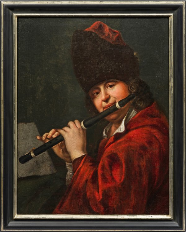 Effektvoll vor einen dunklen Hintergrund komponiertes Bildnis des Hofflötisten, der seinen Kopf mit einer dynamischen Drehung von seinem Notenblatt abwendet und dem Betrachter zudreht. Hierdurch erhält das Gemälde zusammen mit der Komposition aus sich rhythmisch wiederholenden und überkreuzenden Diagonalen eine große, barocke, gleichsam musikalische Lebendigkeit. Kupetzky, ein bedeutender Porträtmaler des Barock hatte ein bewegtes Leben. Aufgewachsen in einer zu den Böhmischen Brüdern gehörenden, streng religiösen Familie, entfloh er dieser, studierte Malerei in Wien, lebte 1686-1709 in Italien, arbeitete danach bis 1723 als Hofmaler in Wien, um dann aus religiösen Gründen nach Nürnberg zu ziehen. Sein durchaus sehr persönlicher Stil verbindet unterschiedlichste Einflüsse aus Holland, Frankreich und Italien. In seinem Oeuvre finden sich eine größere Werkreihe von Musikerporträts, oft in mehreren Versionen. Auch vom vorliegenden Gemälde sind mehr als vier Varianten bekannt, u.a. im Musikinstrumentenmuseum in Berlin (mit szenischem Landschaftshintergrund) und im Germanischen Nationalmuseum in Nürnberg. Öl/Lwd., doubl.; 82 cm x 64 cm. Rahmen.