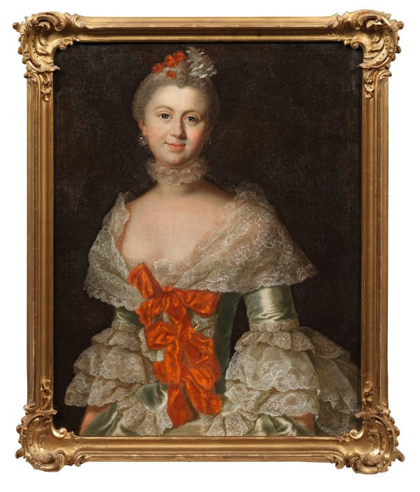 Selbstbewusst, mit wachem Blick, glänzenden Augen und einem Lächeln in ihrem wohlgeformten Gesicht schaut die junge, adelige, elegante Dame anmutig und fast en face mit ganz leicht geneigtem Kopf dem Betrachter entgegen. Die Malerin zeigt deren große Schönheitsreize, die auch in ihrer ästhetischen, schlanken Figur liegen, wobei der lange Hals durch eine kokette Spitzenkrause akzentuiert wird. Im vorliegenden Hüftbildnis von hoher Suggestionskraft gelingt der Künstlerin ein meisterhaftes Bravourstück in der Wiedergabe des Stofflichen, indem sie sowohl die weiß glänzende Seide als auch die zarteste Spitze und funkelnden Steine ihres Schmucks malerisch überzeugend wiedergibt. Belebt wird das Kleid durch leuchtend korallenrote Schleifen, deren Farbe sich in den Blüten ihres dezenten Haarschmucks wiederholt. Geschickt wird die Figur leicht aus der Mittelachse verschoben, was dem Bildnis eine subtile Lebendigkeit verleiht. Mode und Frisur der Dargestellten lehnen sich an französische Vorbilder des Rokoko an, was eine Datierung um 1760-1770 nahelegt. Zu derselben Zeit porträtierte Barbarina Rosina de Gasc dieselbe Dame ein zweites Mal in einem rosa-türkisfarbenen Kleid (versteigert in einer Auktion bei Neumeister, München, 05.12.2018, Los 324). Hierdurch ist sie identifizierbar, denn jenes Bildnis ist rücks. mit "Fräulein von Tchischki-Bögendorff" bezeichnet. Es handelt sich somit um eine Dame aus der Adelsfamilie Tschirschky-Bögendorff, die mit Zweigen in Sachsen, Schlesien und Böhmen vertreten war. Es könnte sich um eine Tochter des Hermann Ludwig Eugen von Tschirschky-Bögendorff handeln, der als Kammerherr am sächsischen Hof diente, und vielleicht war sie dort auch selbst Hofdame. Schöpferin des Gemäldes ist Barbara Rosina de Gasc, die wie ihre Schwester Anna Dorothea Therbusch aus der bedeutenden Malerfamilie Lisiewski stammte. Unterrichtet wurden beide vom Vater, dem polnischen Porträtisten Georg Lisiewski, der sich als Hofmaler in Berlin niedergelassen hatte. In erster Ehe heiratete Barbara Rosina Lisiewska 1741 den preußischen Hofmaler David Matthieu (1697 - 1756). Nach Mathieus Tod wurde Barbara Rosina 1757 als Hofmalerin nach Zerbst berufen, ehe sie 1760 den Professor Ludwig de Gasc, einen Freund Lessings, heiratete und ihm 1764 nach Braunschweig folgte. Am Braunschweiger Hof fand sie in Herzogin Philippine Charlotte eine großzügige Förderin. Einen weiteren Höhepunkt ihrer Karriere markiert die Ernennung zur Hofmalerin in Dresden, wo sie 1769 überdies als Ehrenmitglied in die Akademie aufgenommen wurde. Öl/Lwd.; 80 cm x 59,5 cm. Rahmen.