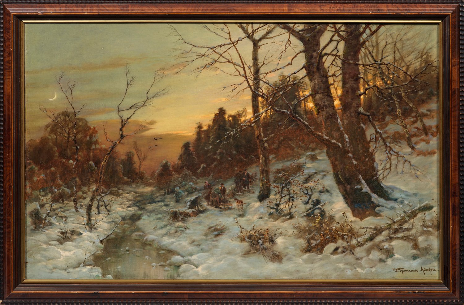 Abendlich gestimmte, tief verschneite, bewaldete Landschaft mit aufgegangenem Halbmond. Thomassin ging 1877 nach München, wo er sich der Doppelbegabung sowohl der Musik als auch der Landschaftsmalerei widmete. Zudem stand er der Dachauer Künstlerkolonie nahe. Sein vielseitiges, künstlerisch qualitätvolles, malerisches Oeuvre umfasst neben holländischen Motiven und vielfältigen Winterlandschaften, vornehmlich Darstellungen aus dem oberbayerischen Raum und bäuerlichen Genreszenen, insbesondere Heuernten. Öl/Lwd., doubl.; R. u. sign. mit Ortsangabe München. 62 cm x 99,5 cm. Rahmen.
