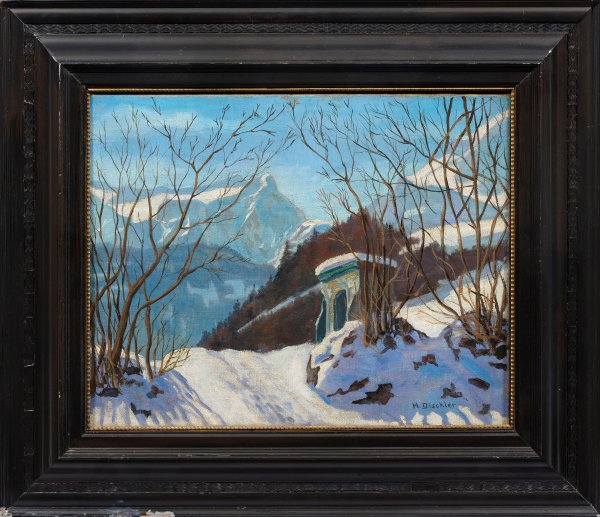 Blick von einer Anhöhe mit dem Bildstock auf hohe Berge. Von blau-violetten Tönen des Schnees dominierte Landschaft Dischlers, in dessen Oeuvre die von ihm mit Vorliebe geschaffenen winterlichen Schneebilder einen Schwerpunkt bilden und wodurch sie ihm die Bezeichnung "Schneemoler" eintrugen. Dischler studierte bei Gustav Schönleber in Karlsruhe und errichtete sich 1907 ein Künstlerhaus in Hinterzarten. Studienreisen und längere Aufenthalte führte ihn durch Süddeutschland, besonders das heutige Baden-Württemberg und den Schwarzwald: u. a. auf der Zastler Hütte, auf der Halde (Schauinsland), in St. Märgen und auf der Todtnauer Hütte. Öl/Lwd.; R. u. sign.; 47 cm x 60,5 cm. Rahmen.
