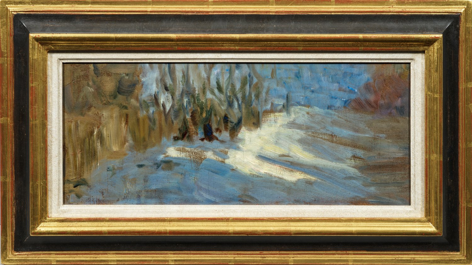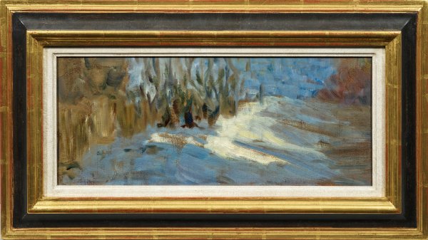 Mit lockerem, breitem Duktus gemalte, impressionistische Landschaftsstudie aus Dänemark. Der 1886-1892 an der Kopenhagener Akademie ausgebildete Maler befasste sich vielseitig mit Landschaften, mit figürlichen Szenen, Bildnissen und Interieurs. Als Weltreisender lebte er lange Jahre in Indien, besuchte zudem China, Japan, Indonesien und Sumatra. Öl/Lwd.; Auf dem Keilrahmen Stempel der Pedersen-Gedächtnis-Ausstellung in Aarhus 1959, Nachlass-Etikett, Auktions-Etikett der Auktion 214 im Kunstsalonen in Aarhus am 24.11.1959, kleines Etikett mit Nr. 124 u. dänischer Bez. u. Betitelung "Sne i Havn, Hegnstoft". 18 cm x 43 cm. Rahmen.