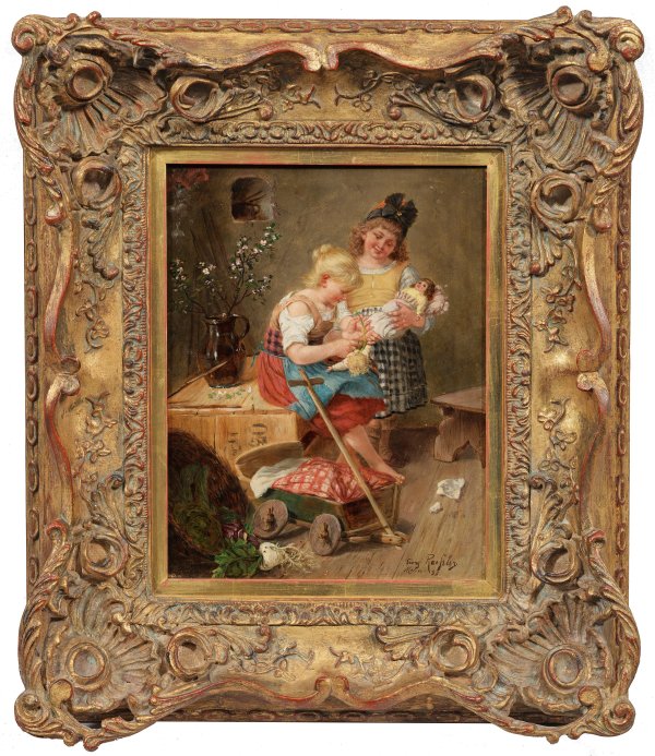 In einer einfachen Kammer mit spärlichem Mobiliar, zwei Mädchen liebevoll ihre Puppenkinder umsorgend und dabei in ihr Spiel vertieft. Subtil charakterisiertes, reizvolles Genrebild Rösslers, der Schüler bei Johann von Schraudolph in München war. Neben den einfühlsam inszenierten Genreszenen schuf er unzählige bayerische Charakterköpfe und ansprechende Kinderbildnisse. Öl/Holztafel. R. u. sign. mit Ortsangabe M(ün)ch(e)n. u. dat. (18)93. 27 cm x 21 cm. Rahmen.