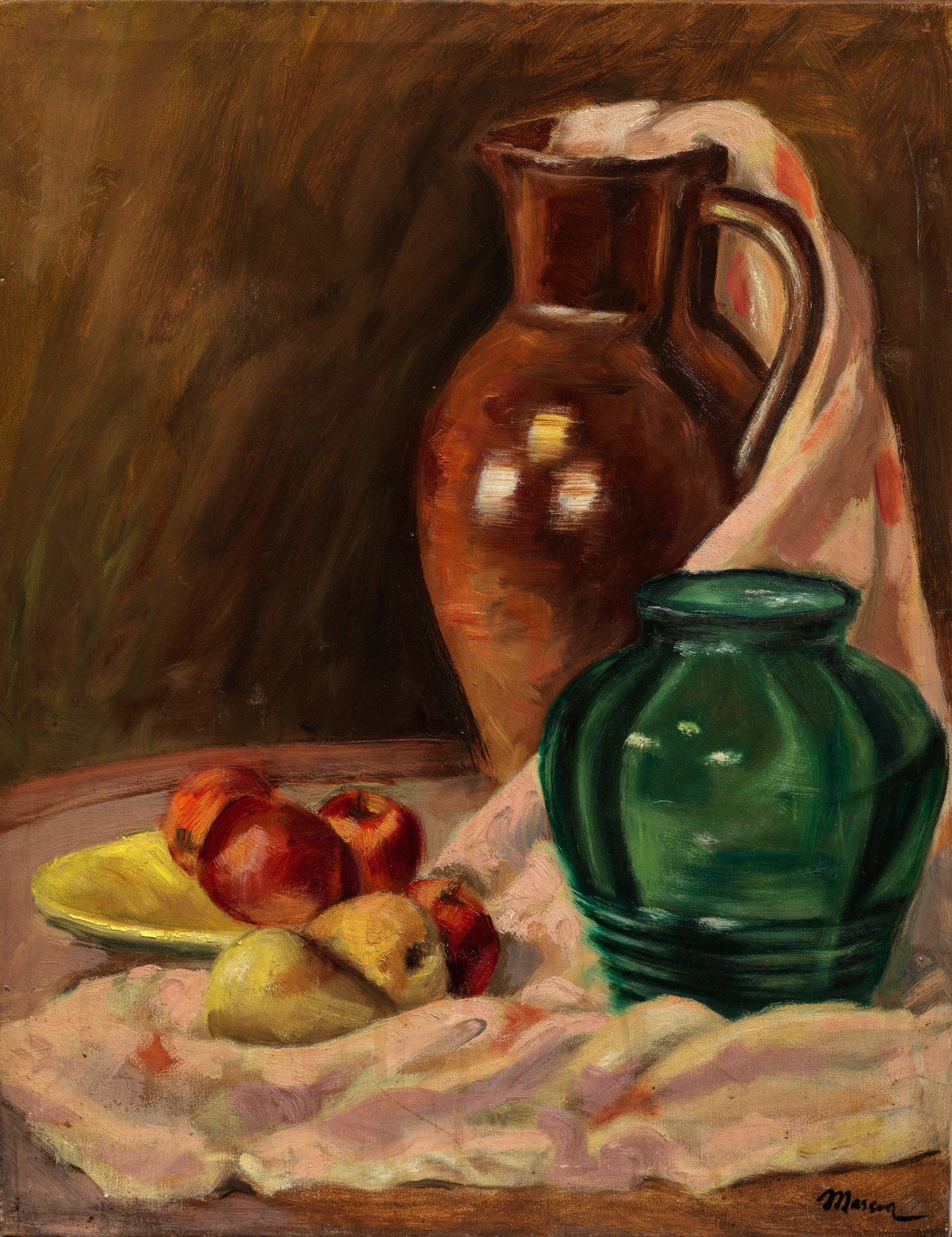 Der französisch-deutsche Maler kam 1865 nach Berlin, studierte an der Berliner Akademie bei Carl Steffeck und Hermann Freese sowie an der Kunstschule Weimar. Seit 1884 stellte Mosson in Berlin aus, 1892 war er Mitbegründer der "Vereinigung der XI" und 1898 Gründungsmitglied der "Berliner Secession". Nach deren Spaltung 1913 ging er gemeinsam mit Max Liebermann, Max Slevogt und weiteren zur "Freien Sezession". Ein Hauptsujet seines Oeuvres waren Stillleben. Öl/Lwd.; R. u. sign.; 50 cm x 39,5 cm.