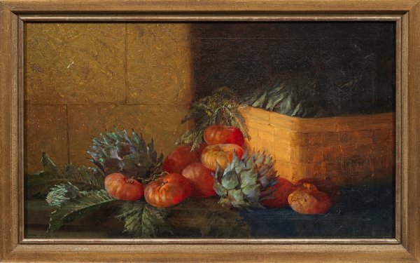 Stillleben mit Artischocken, Tomaten und Spankorb