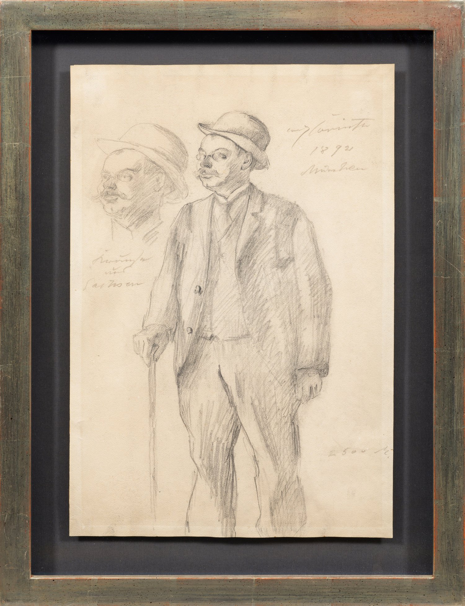 Meisterhaft ausgeführtes Bildnis als Dreiviertelfigur und daneben komponierter Kopf in der Tradition von Adolph von Menzel, entstanden 1892 in München. Der fortschrittliche Maler, Zeichner und Grafiker Lovis Corinth gehörte neben Max Liebermann, Max Slevogt und dem befreundeten Walter Leistikow zu den prägenden Künstlern seiner Zeit. Sein künstlerischer Weg führte ihn vom Realismus über den Impressionismus bis zum Expressionismus. Nach Studien in München, Antwerpen und Paris war Corinth seit 1891 in München ansässig, wo er Anschluss an die "Revolutionäre" der dortigen Kunstszene fand. 1892 wurde er Mitbegründer der "Münchener Secession", der sich neben Corinth u. a. Liebermann, Wilhelm Trübner, Franz von Stuck und Fritz von Uhde anschlossen. 1893 gehörte Corinth zu den Gründungsmitgliedern der "Freien Vereinigung der XXIV", ein Vorläufer der 1898 gegründeten "Berliner Secession". Im Herbst 1901 zog er nach Berlin, wurde Mitglied der "Berliner Secession" und 1911 deren Vorsitzender. Bleistift/Velin. R. o. sign. u. dat. 1892 mit Ortsangabe München, am linken Rand betitelt. 47,3 x 30,4 cm. Rahmen.