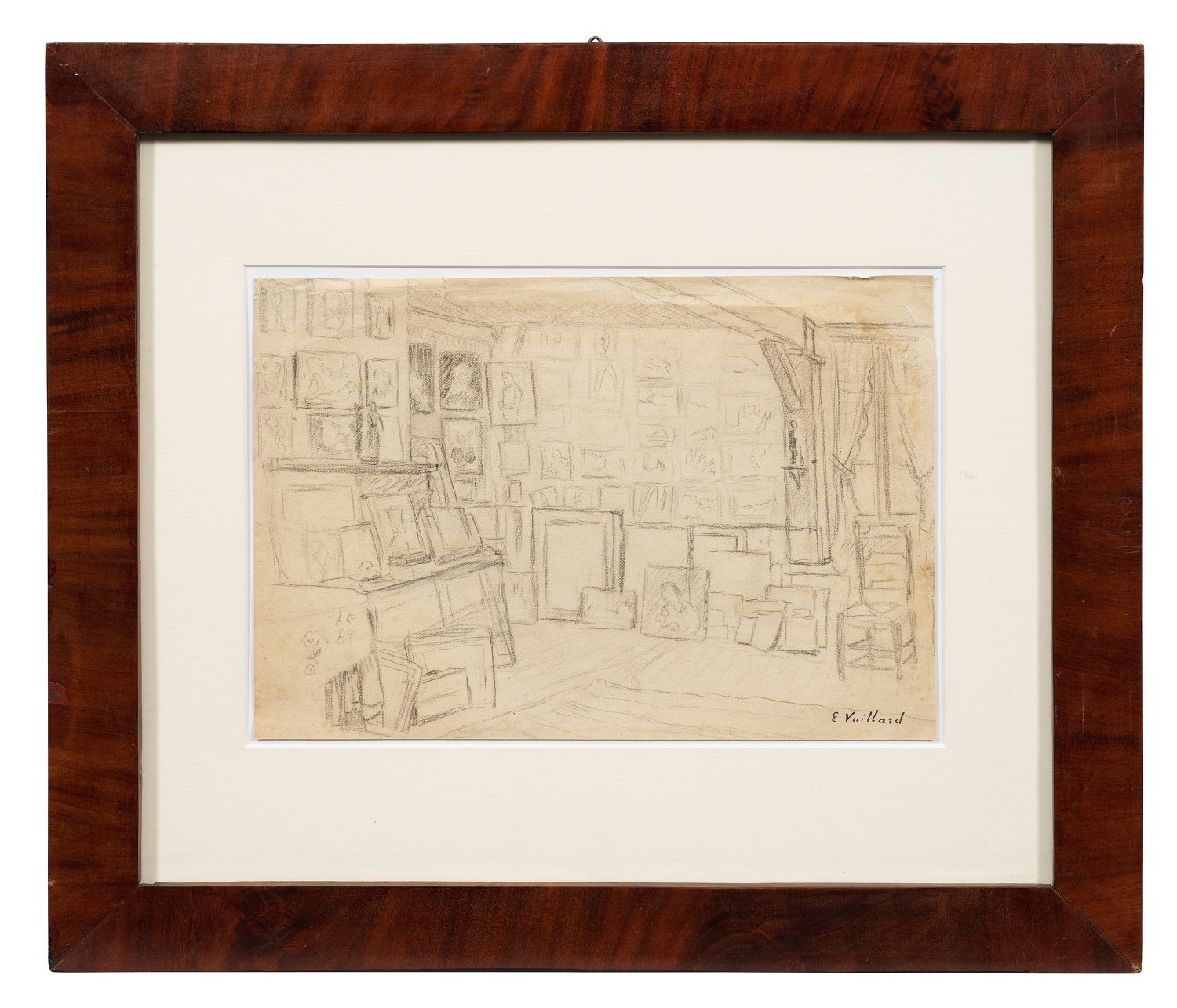 Mit gekonnt flüchtigem, dynamischem Strich gezeichnete, charakteristische Atelierstudie Vuillards, der neben Pierre Bonnard, Maurice Denis, Paul Sérusier und Félix Valloton Mitglied der Künstlergruppe Les Nabis war und zu den Hauptvertretern des französischen Postimpressionismus zählt. Die Zeitschrift La Revue blanche veröffentlichte zahlreiche herausragende Arbeiten des Künstlers. Neben der Malerei und seiner Tätigkeit als Grafiker, insbesondere als Lithograph, war er ein leidenschaftlicher Amateurfotograf, wobei seine Aufnahmen oftmals als Vorlage für seine Gemälde dienten. Bleistift/Papier. R. u. Sign.-Stempel (Lugt 2497a). Verso Porträtstudie einer älteren Dame, möglicherweise der Mutter des Künstlers. 21,5 cm x 30,3 cm. Rahmen.