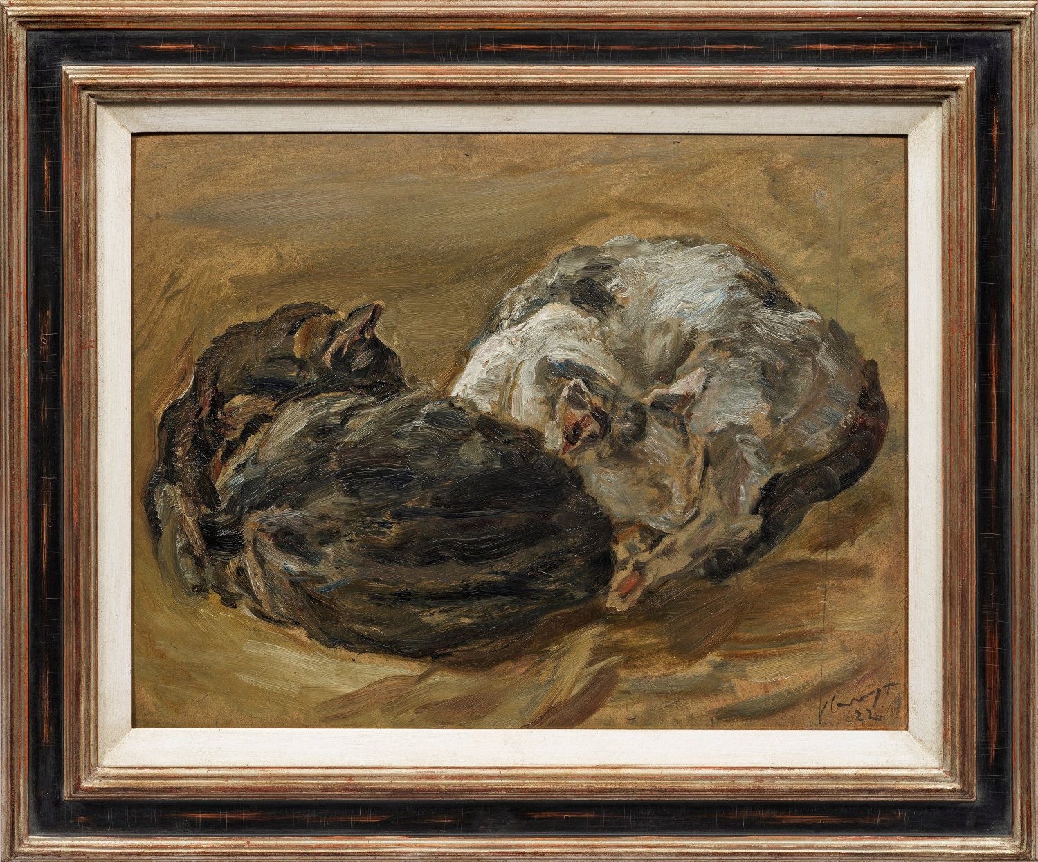 Diese 1922 entstandene, mit schwungvoll lockerem, breitem, impulsivem Duktus und teilw. pastosem Farbauftrag ausgeführte Darstellung einer weißen, gefleckten und einer dunkelgrauen Katze, die aneinander gekuschelt nebeneinander liegen, gehört zum reifen Spätwerk des bedeutendsten deutschen Impressionisten neben Lovis Corinth und Max Liebermann. Das Gemälde ist ganz auf die Gesamtstimmung angelegt und die Pinselstriche miteinander verwoben, wodurch es im Detail einen hohen Abstraktionsgrad erhält. Mehrfach schilderte Slevogt in seinem Oeuvre Katzen, zu denen er offenbar eine Vorliebe hegte und sich auch selbst als Haustiere hielt - wie Darstellungen seiner Frau Nini mit Katze, ein Gemälde von 1904 mit schlafender Katze und einem Katzenjungen sowie eine radiertes Selbstbildnis mit Katze belegen. Slevogt studierte 1884-1889 an der Münchener Akademie, es entstanden erste Landschaften in Neukastel. 1889/90 ging er an die Académie Julian in Paris, bevor er nach 1890 in München ansässig wurde. 1892 gehörte Slevogt zu den Gründern der "Freien Vereinigung der XXIV" aus der "Münchener Secession". 1901 ließ er sich gemeinsam mit Lovis Corinth in Berlin nieder und wurde Mitglied der "Berliner Secession". 1914 nahm ihn die Preußische Akademie der Künste in Berlin als Mitglied auf, 1917-1932 war er Vorsteher eines Meisterateliers für Malerei an der Akademie der Künste in Berlin. Öl/Malkarton. R. u. sign. u. dat. (19)22. 38 cm x 50 cm. Rahmen.