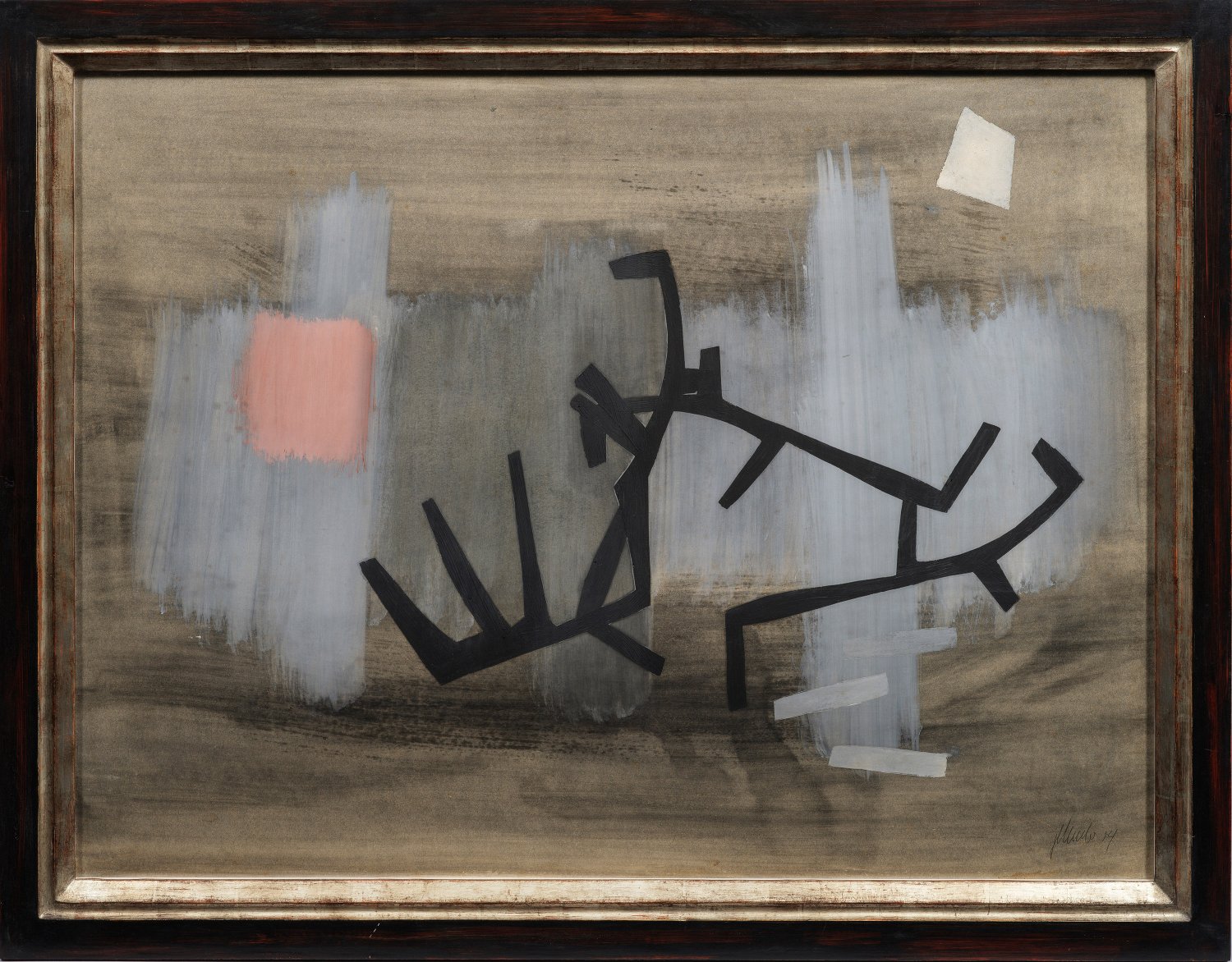 Mixed media with oil and gouache on cardboard. Signed and dated (19)54.