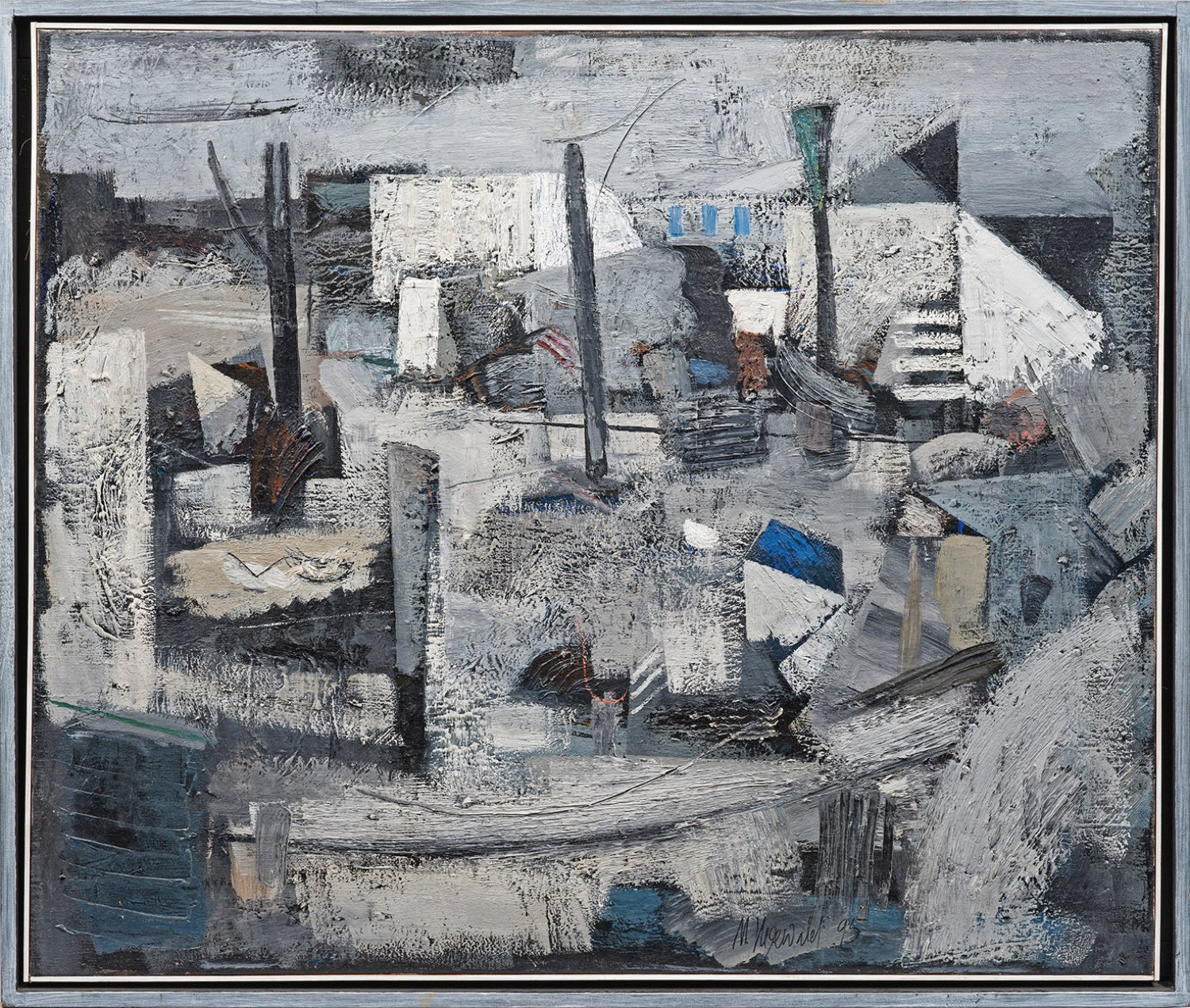 Für das Oeuvre Hegewalds in Motiv und Stil repräsentative Arbeit mit menschenleerer Küstenlandschaft in Grautönen und wenigen, dezenten Farbakzenten, bei der er erratisch verstreute, stereometrische Architekturelemente und Masten wiedergibt, inspiriert vom Kubismus eines Fernand Léger oder Juan Gris sowie den Pittura metafisica-Kompositionen von Giorgio de Chirico. Öl/Lwd.; R. u. sign. u. dat. (19)95. Verso betitelt u. dat. 1995, Ausstellungs-Etikett mit Künstler-Bez., Titel u. Nr. 12. 100 cm x 120 cm. Rahmen.
