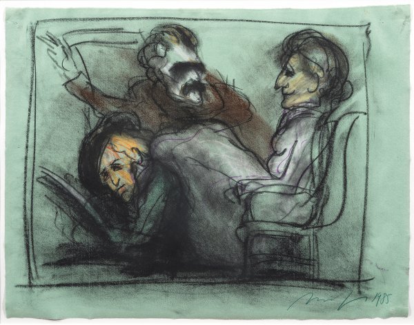 Mit furiosem Duktus ausgeführte, expressive Darstellung, bei der Richard Wagner mit seinem charakteristischen Hut dem Betrachter entgegenblickt, während der dämonische Nietzsche in deklamatorischer Geste mit erhobenem rechten Arm erscheint und rechts Winifred in thronender Pose im Profil geschildert wird. Der bedeutende Wiener Künstler setzt sich hierbei kritisch mit den Persönlichkeiten Richard Wagners und Nietzsches, aber auch der unrühmlichen Rolle Winifred Wagners (seit 1923 bekennende Nationalsozialistin und glühende Hitler-Freundin und -Verehrerin) auseinander, die 1930 die Leitung der Bayreuther Festspiele übernahm und erst 1949 offiziell aufgab. Hrdlicka, bekennender Wagner-Feind, schuf im Entstehungsjahr des vorliegenden Blattes 1985 auch eine Wagner-Büste in Bronze, einen Radierzyklus zu Richard Wagner und Adalbert Stifter sowie verfasste bissige Text zu Wagner; 2000/01 folgten Bühnenbilder Hrdlickas für eine legendäre "Ring"-Inszenierung im Theater in Meiningen. Mischtechnik/blaugraues Bütten. R. u. sign. u. dat. 1985. 48 cm x 62 cm. Rahmen.