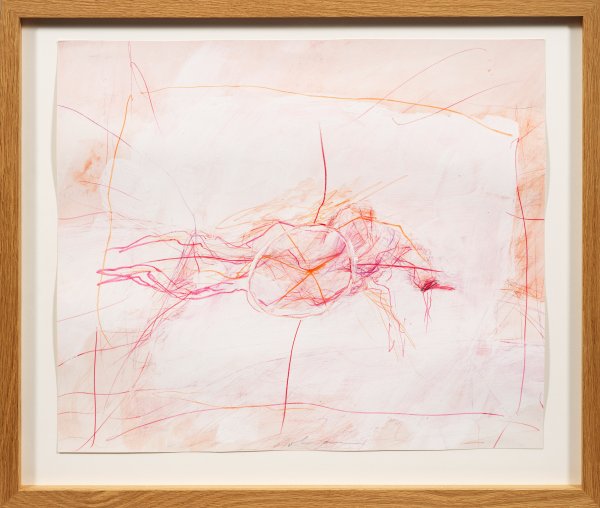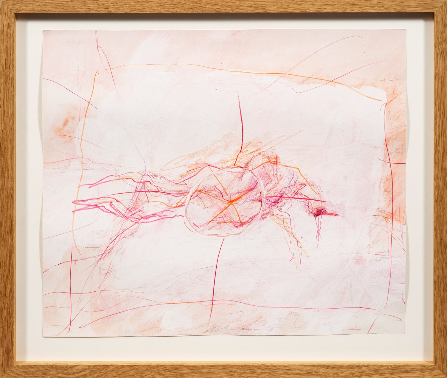 In Farbe und Form reduzierte Abstraktion mit weißen Flächen und einer zentralen Kreisform, eingerahmt und durchdrungen von rottonigen, feinen Linien. Charakteristisches Blatt Bohrmanns, der ab 1947 an der Schule für Kunst und Handwerk in Saarbrücken und anschließend bei Willi Baumeister an der Stuttgarter Akademie studierte. 1959-1972 war der Künstler in München ansässig. Neben seiner Tätigkeit als Komponist und der Malerei, Grafik und Fotografie schuf Bohrmann vor allem ein umfangreiches zeichnerisches Werk, das sich stets zwischen Abstraktion und Figuration bewegte. Seine Motive - Figuren, Landschaften und Stillleben - werden in zahlreichen Variationen immer wieder aufgegriffen, ohne sich jedoch zu wiederholen. Ein wesentliches Merkmal seiner Arbeiten ist die Auseinandersetzung mit Räumlichkeit, die durch ein spannungsreiches Zusammenspiel von Linien und Flächen gekennzeichnet wird, wie dies auch im vorliegenden Blatt deutlich in Erscheinung tritt. Mischtechnik/Papier. Mittig u. sign.; Verso auf Galerieetikett bez., betitelt und dat. 1963. 43 cm x 51,2 cm. Rahmen.
