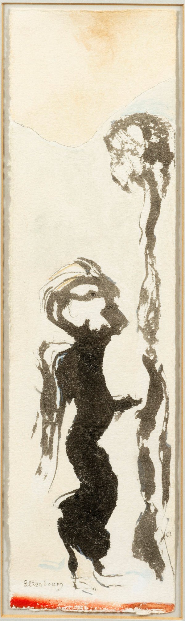 Reduzierte, zarte Komposition, bestimmt von zwei figurativ anmutenden, schwarzen Bildelementen. Charakteristische Arbeit des Künstlers, der mit seinen tiefsinnigen, poetischen Werken zu den bedeutendsten deutschen Malern und Grafikern nach 1950 zählt. Altenbourg wurde ab 1951 im Westen durch viele Ausstellungen wie der "documenta II" bekannt und vielfach ausgezeichnet. Aquarell und Bleistift/Bütten. L. u. sign. sowie r. monogr.; 28,5 cm x 8 cm. Rahmen.