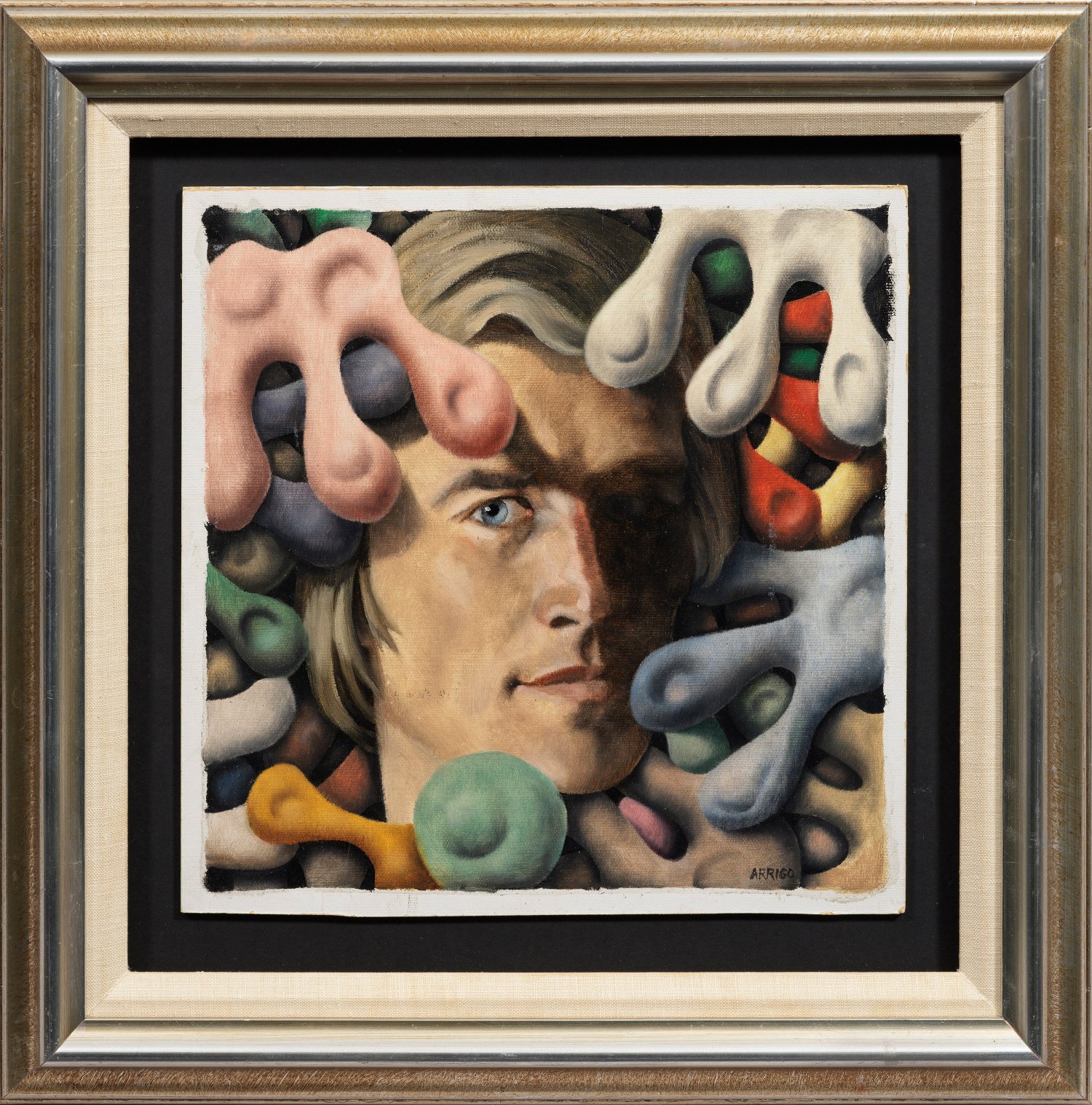 Ausschnitthaft und mit effektvollen Schatten konzipierte Komposition, die einen junger Mann darstellt, der in bunten, weich anmutenden Formen zu versinken scheint. Phantastisches Werk des an der Akademie in München ausgebildeten Künstlers, der Privatschüler bei Christian Rohlfs, Eberhard Viegener und Otto Pankok war. Öl/Platte. R. u. sign.; 31,1 cm x 31,6 cm. Rahmen.