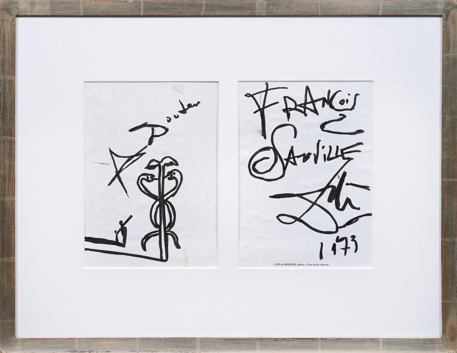 Ausgeführt auf Vorsatzblättern des Buches "Les Diners de Gala" von Salvador Dalí, erschienen bei Drager Éditeur, Paris 1973. Eine Zeichnung zeigt einen Äskulapstab (oder Asklepiosstab) und zwei stilisierte, kleine Figuren, die andere den kalligraphisch gestalteten Schriftzug mit Signatur "Francois Sauville Dalí 1973". Der Name François Sauville in Zusammenhang mit dem Äskulapstab kann sich nur auf den französischen plastisch-ästhetischen Chirurgen beziehen, der auch als Buchautor ("Chirurgien du Bonheur") bekannt wurde. Schwarzer Filzstift/Papier. Sign. u. dat. 1973. Partiell ger. fleckig u. knickfaltig. Jeweils ca. 7,2 cm x 19,7 cm. Zusammen nebeneinander gerahmt.