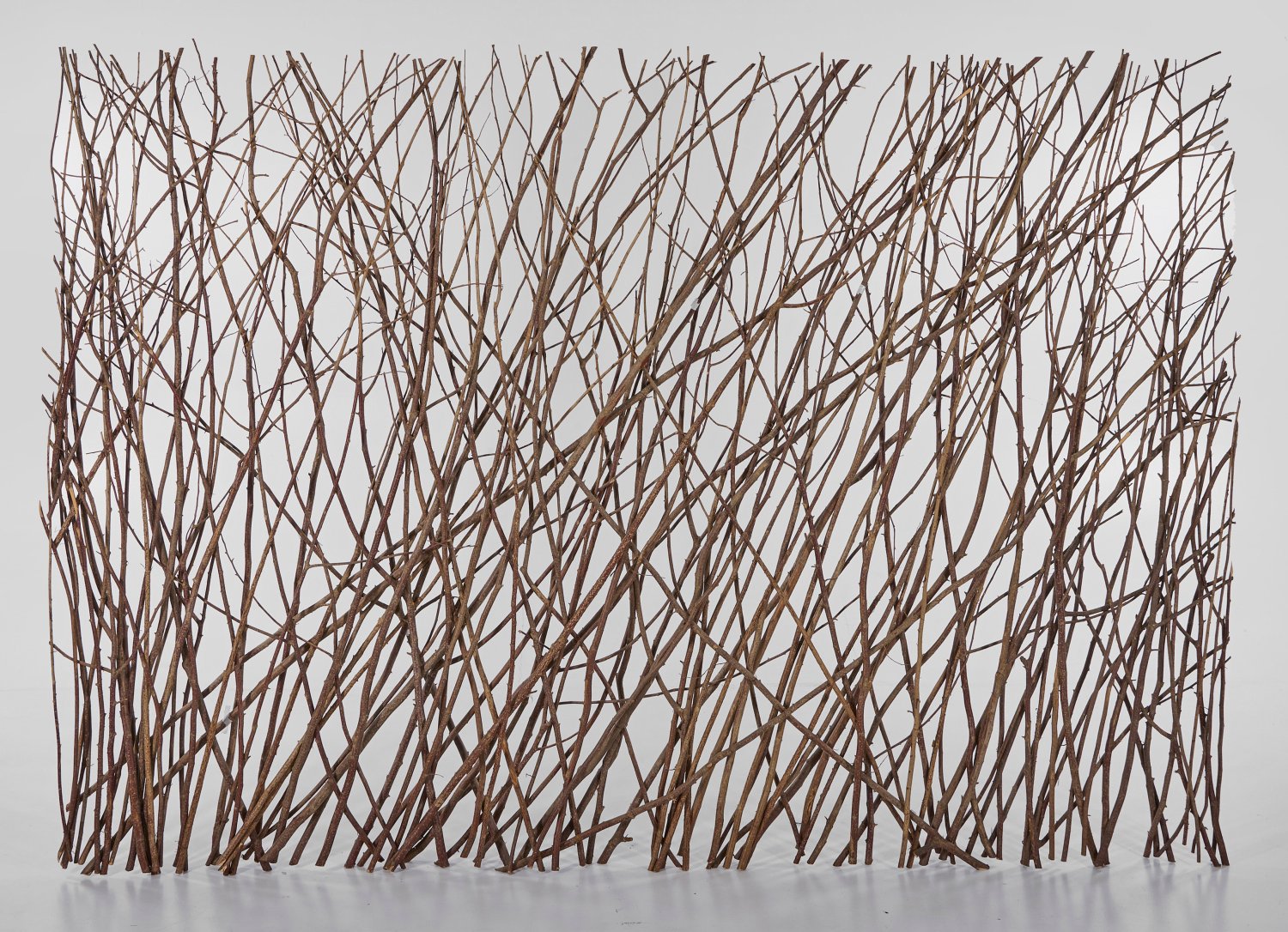 Haselnussholz und Draht. Gerade und schräge Vertikale aus naturbelassenen Haselnussästen, die zu einem lockeren Raster verwoben wurden. Statt mit Pinsel und Leinwand arbeitet Almut Linde mit Menschen und sozialen Systemen und beschäftigt sich mit den Grundprinzipien der menschlichen Existenz. Bereits in den 1990er Jahren entwickelte die Konzeptkünstlerin, Fotografin und Bildhauerin unter dem Begriff "Dirty Minimal" eine eigene Interpretation der Minimal Art, die das Alltägliche und Übersehene in den Fokus ihrer Untersuchungen rückt. Dabei verbindet sie Formen der Minimal Art mit sozialpolitischen Inhalten und Anspielungen an romantische Bildvorstellungen. Ausgebildet an der Hochschule für Bildende Künste Hamburg als Meisterschülerin von Bernhard Johannes Blume und Franz Erhard Walther, stellte Linde bereits während ihrer Studienzeit mit der Künstlergruppe Linde Ludeña Sierra (bestehend aus: Almut Linde, Manuel Ludeña, Santiago Sierra) national und international aus. Ihr Werk wurde u.a. mit dem HAP GrieshaberPreis und dem Kunstbeutel Hamburg ausgezeichnet. Ca. 200 cm x 300 cm.