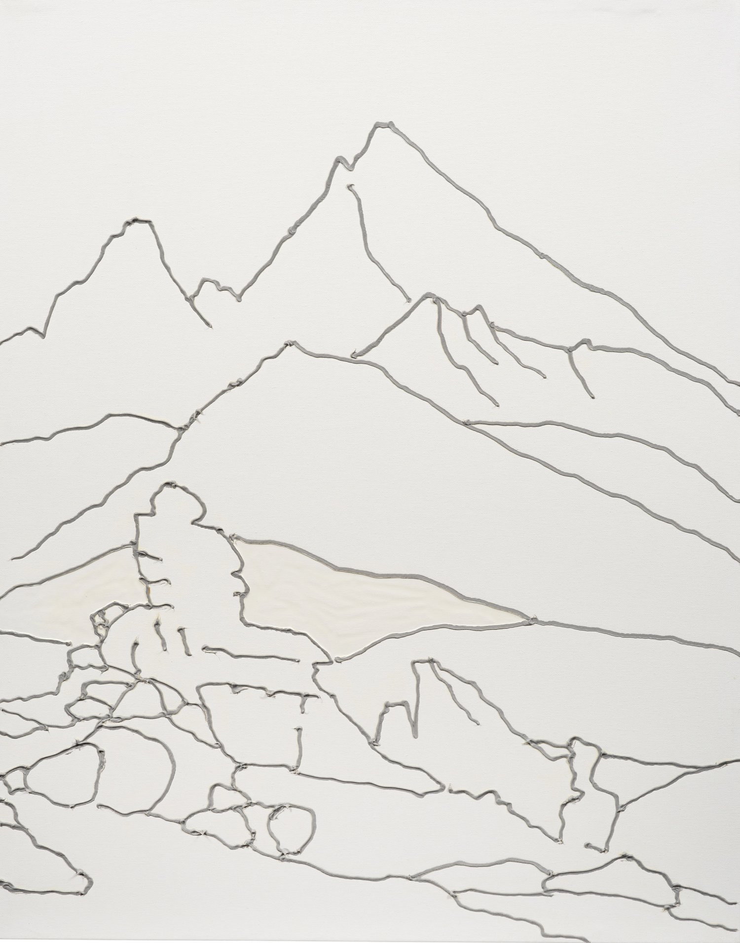 Auf Weiß mit hellgrauem Akzent reduzierte Komposition mit schwarzer Konturlinie. Lediglich auf Grundformen und -linien reduziertes Zitat des berühmten Gemäldes "Der Wanderer über dem Nebelmeer" von Caspar David Friedrich. Das Werk stammt aus der Folge der sog. "Bastard-Paintings", in denen Drühl sich einer bekannten kunsthistorischen Vorlage bedient und diese lediglich auf Grundformen reduziert und in (fast) rein weißen Arbeiten mit schwarzer Kontur umsetzt. Öl u. Silikon/Lwd.; Verso sign., betitelt und dat. 2003. 80 cm x 100 cm.