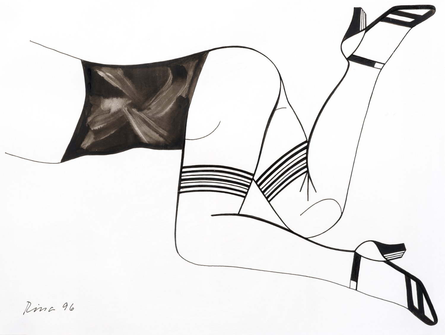Die 1996 geschaffene Arbeit stammt aus einer Werkreihe mit erotischen Zeichnungen Rissas, indem sie Erotik aus männlich-voyeuristischem Blick bzw. selbstbewusster, weiblicher Sicht thematisierte: Frauen mit High Heels in Strapsen oder halterlosen Strümpfen. Die Pop Art-Anmutung verbindet sie mit der deutlichen Aussage von weiblicher Erotik und Anziehungskraft, wobei die Strümpfe zugleich einen Fetischaspekt haben. Rissa studierte 1960-1965 zusammen mit Sigmar Polke und Gerhard Richter an der Düsseldorfer Akademie bei K. O. Götz (den sie 1965 auch heiratete). 1969-2007 wirkte sie dort selbst als Dozentin bzw. Professorin. Bereits seit ca. 1965 setzt sie sich künstlerisch intensiv mit weiblicher Sexualität und Rollenbildern auseinander. Tusche u. Gouache/Papier. L. u. sign. u. dat. (19)96. Verso auf der Rückplatte betitelt u. dat; 36 cm x 48 cm. Rahmen.