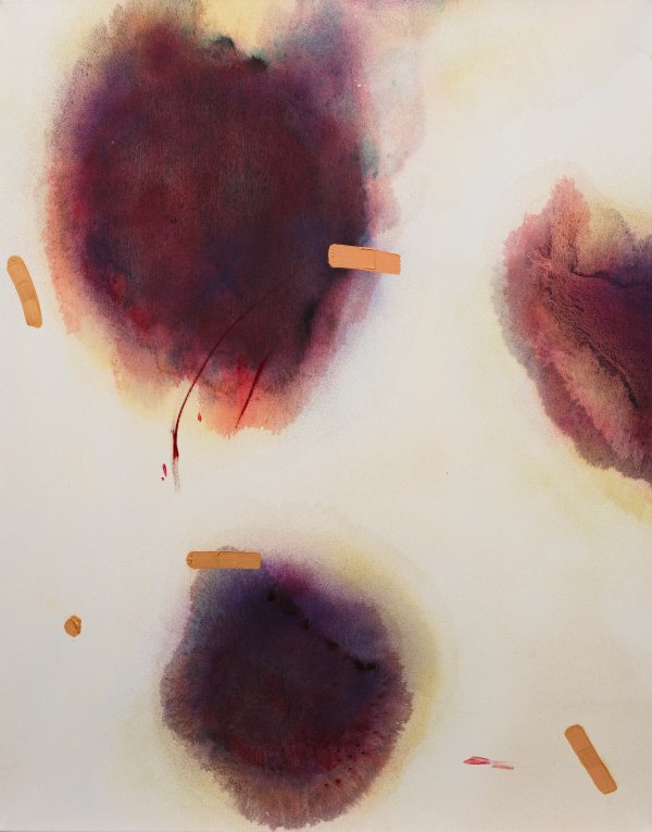 Auf einer weißen Fläche treten violett-rote Farbflecken mit Pflaster-ähnlichen Streifen in Erscheinung, die als vergrößerte Hämatome gedeutet werden könnten. Pfeiffer, der 2005-2011 an der Universität der Künste in Berlin bei Valérie Favre und als Meisterschüler bei Thomas Zipp studierte, fühlt sich in seinen Arbeiten weder einer relationalen noch einer linearen Ordnung verpflichtet, er kann völlig frei von Regeln und Zwängen mit seiner Malerei beobachten, aufgreifen, zitieren und kommentieren. Acrylmischtechnik/Lwd.; Verso sign., dat. 2014 sowie betitelt. 100 cm x 80 cm.