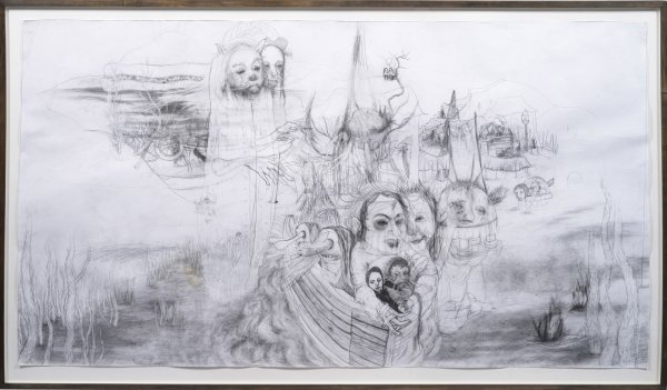 Phantastische und erzählerische Szene, in der sich zarte und gleichzeitig furchteinflößende Gestalten in einer (alb-)traumhaften Landschaft tummeln. Haslinger, die 2003-2010 an der Hochschule für Bildende Künste Braunschweig bei Hartmut Neumann, Johannes Brus und als Meisterschülerin von Walter Dahn studierte, komponiert in ihren skurrilen, meist großformatigen Zeichnungen traumhafte Bildszenen, die von Gegensätzlichkeiten geprägt sind. Sanfte, poetische Geschöpfe bevölkern ebenso wie grobschlächtige Hybridwesen mit skurrilen Physiognomien die verbildlichten "Kopfreisen", der Künstlerin, die sich zwischen Imagination und Wirklichkeit, Wissen und Phantasie bewegen. Bleistift/Papier, 2007. 120 cm x 204 cm.