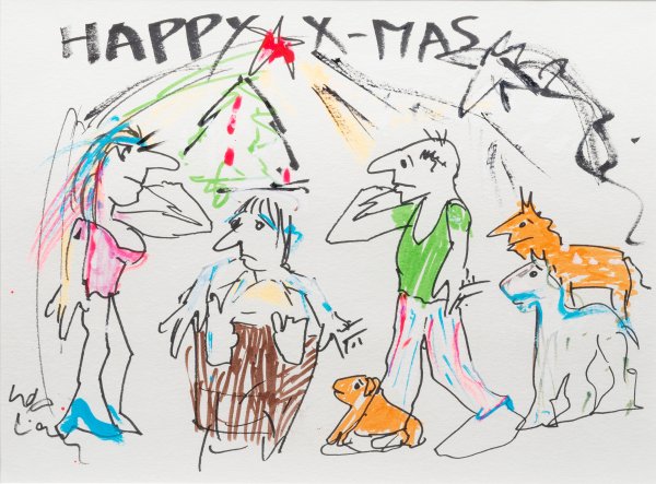 Expressive, die Figuren mit dynamischen, schwarzen Konturen erfassende Szene, einen jungen Mann liegend in einem hölzernen Bottich dargestellt, flankiert von einer spärlich bekleideten Frau und einem Herren mit grünem, tief ausgeschnittenem Hemd, begleitet von drei Tieren. Über dem Protagonisten erhebt sich die Silhouette eines Christbaums mit bekrönendem Weihnachtsstern. Skurrile, durch leuchtende Farben akzentuierte, freie Interpretation einer weihnachtlichen Stallszene mit dem "Christuskind" in der Krippe, seinen Eltern Maria und Josef und den Stalltieren. Der bedeutende, bis heute aktive Rockmusiker Udo Lindenberg entdeckte in den 1990er Jahren die Malerei für sich, bei der er Cartoon und Karikatur verbindet. Einer ersten Ausstellung 1996 folgten zahlreiche weitere, darunter 2005 mit dem Titel "Keine Panik. Udo Lindenbergs bunte Republik" im Haus der Geschichte in Bonn. Seine Bilder befinden sich u. a. im Bundeskanzleramt, im Jahr 2010 wurden zudem zwei von ihm gestaltete Sondermarken herausgegeben. Mischtechnik/Bütten. L. u. sign.; Oberhalb betitelt. 35 cm x 47 cm (Passepartoutausschnitt). Rahmen.