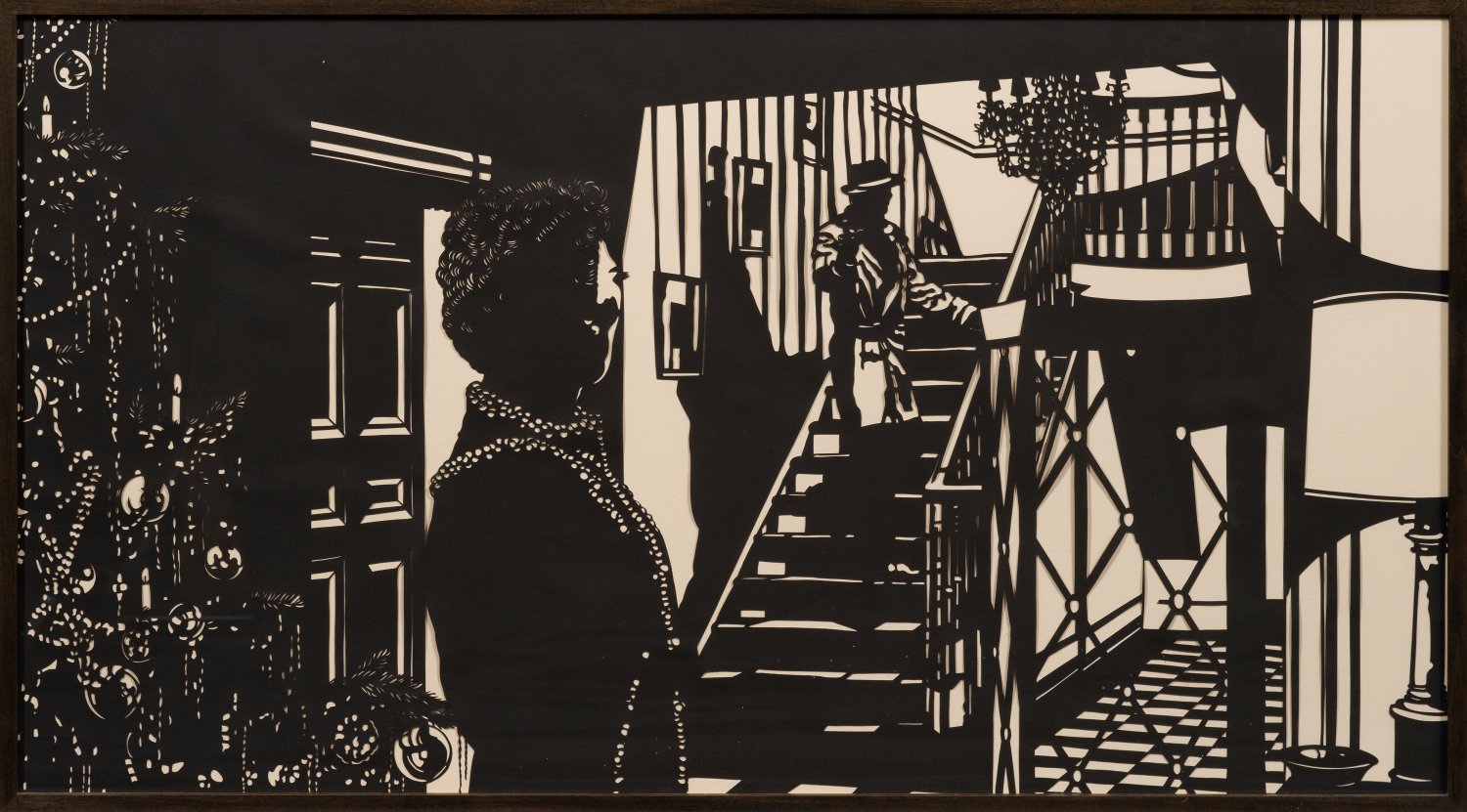 Filmstill aus dem Melodram "Was der Himmel erlaubt" von Douglas Sirk aus dem Jahr 1955, umgesetzt als filigraner Scherenschnitt. Der Berliner Künstler Stefan Thiel, der an der Hochschule der Künste Berlin als Meisterschüler von Dieter Appelt studierte, findet die Motive seiner aufwendigen Scherenschnitte nicht nur in eigenen Fotografien, sondern greift auch vielfach auf Filmmaterial zurück. Die verwendeten, auf schwarz-weiß reduzierten, isolierten Stills sind nicht mehr ohne weiteres der filmischen Vorlage zuzuordnen und thematisieren dabei keine Schlüsselszenen; das Augenmerk gilt beiläufigen, eher banalen Ereignissen der Filmhandlung. Scherenschnitt/Papier, 2010. Verso sign. u. dat.; Verso Etikett der Mai 36 Galerie, Zürich, und der Galerie September, Berlin. 53 cm x 96,5 cm. Rahmen.