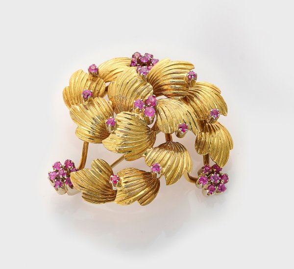 Gelbgold, gest. 750. Stilisierte reliefplastisch gearbeitete Blattbrosche, besetzt mit pinkfarbenen Rubinen. Gew. ca. 13,96 g.