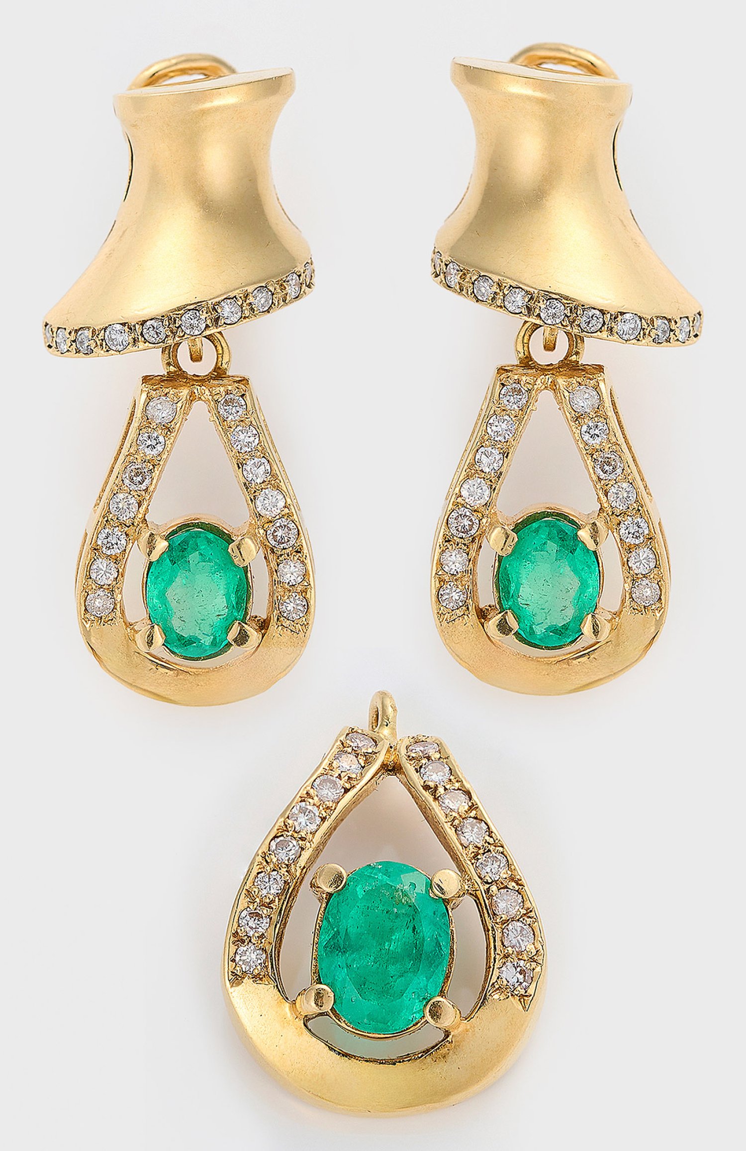 Paar Ohrgehänge und korrespondierender Anhänger. Roségold, gest. 18 ct.; Schauseitig besetzt mit Smaragden von zus. ca. 5,00 ct. und Brillanten von zus. ca. 1,30 ct.; Ges.-Gew. ca. 31,11 g. Beiliegend GRS-Expertise.